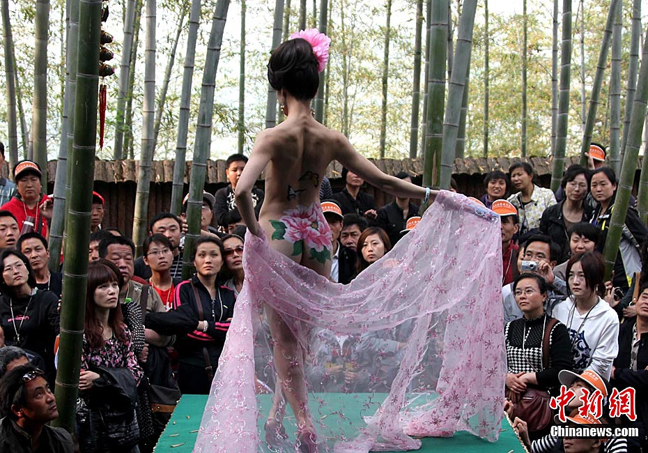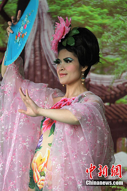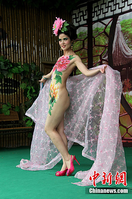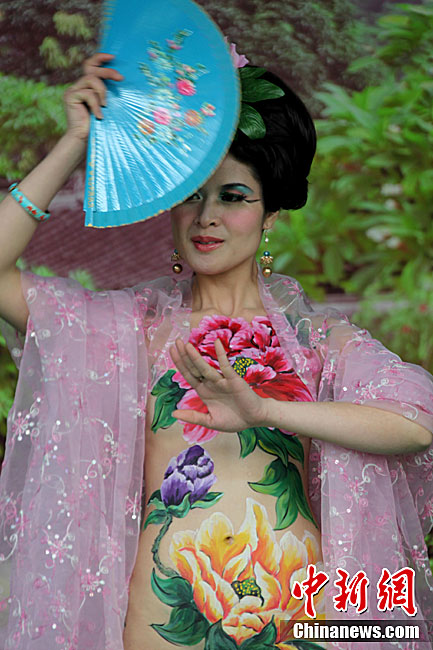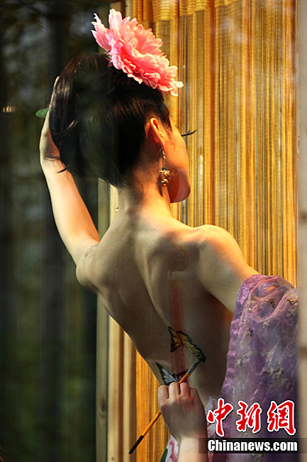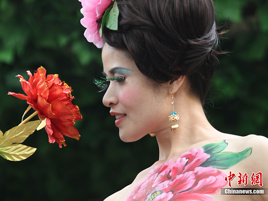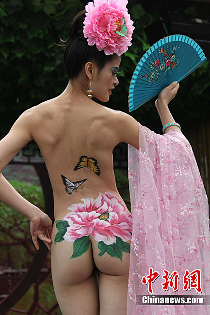 4月22日,黄山芙蓉谷风景区上演一场“蝶飞花舞”人体彩绘秀。彩绘艺术家在一位专业模特身体上创作出四朵惟妙惟肖的牡丹花图案和两只飞舞的蝴蝶,优美火辣的人体秀姿与盈盈欲滴的牡丹花卉相得益彰,吸引众多游客和摄影爱好者。方也广德 摄 图片来源:CNSPHOTO