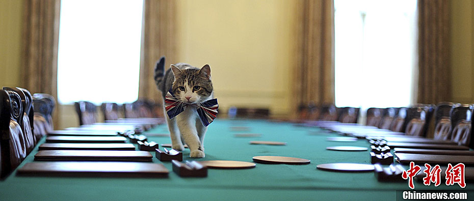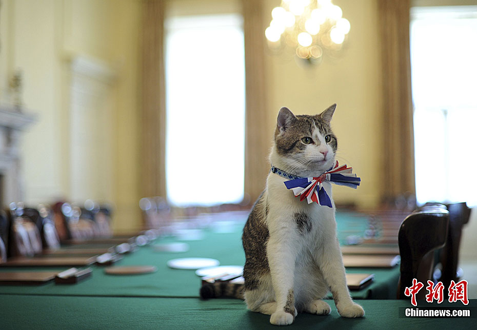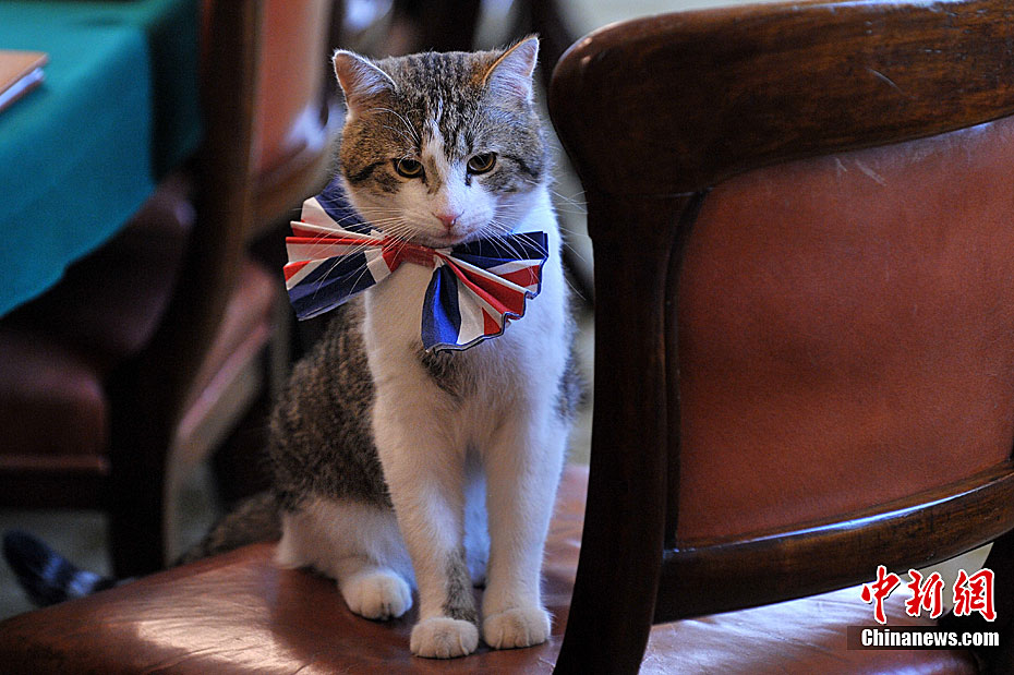当地时间4月28日,英国伦敦唐宁街内阁办公室的猫咪也带上国旗领结一沾威廉王子(Prince William )和准王妃凯特(Catherine Middleton )的喜气。