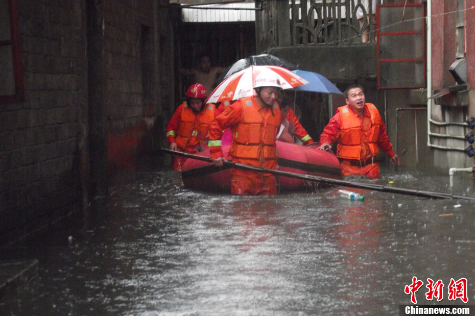 江西萍乡城区水深齐腰 消防官兵挨户寻找被困居民