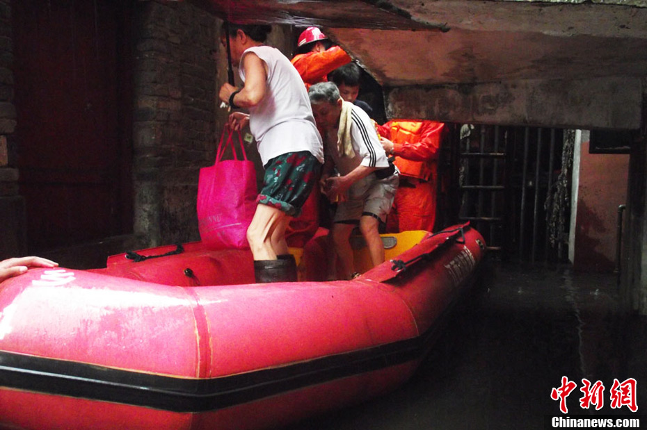 6月15日凌晨,一场特大暴雨降临萍乡,瓢泼大雨迅速汇流成“河”,萍乡市不少街区被大水淹没。图为消防官兵护送被困居民登上橡皮艇。丁宏 摄