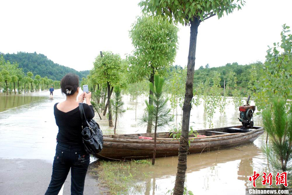 6月15日下午,江西省德兴市往弋阳县方向的道路被洪水淹没,有渔民利用木船运送被困旅客。王剑 摄