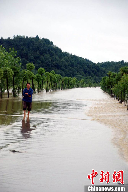 6月15日下午,江西省德兴市往弋阳县方向的道路被洪水淹没,被困居民探访前方被淹道路后无奈而返。王剑 摄