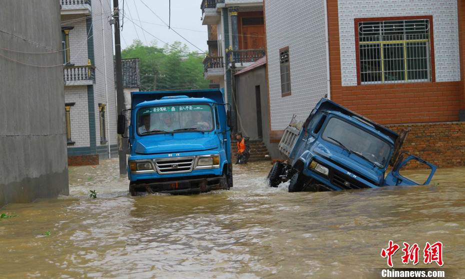 6月15日,江西省乐平市接渡镇湖滨村莲湖洲被乐安河水围困成一座“孤岛”,150多名村民被困。景德镇军分区官兵和预备役人员100多人携带10艘冲锋舟赶赴乐平,与乐平市、接渡镇干部一道投入抢险救援,将被困全部150余名村民撤离到安全地带并妥善安置。江西乐平连日遭遇罕见强降雨,造成20个乡镇不同程度受灾,全市受灾群众达35.72万人,10万军民投入防汛抢险,截至15日21时,乐平市共转移受灾群众 8.8万人。图为6月15日下午,一辆农用车行驶在被水淹的江西省乐平市接渡镇莲湖洲对岸李家村。程万海 摄