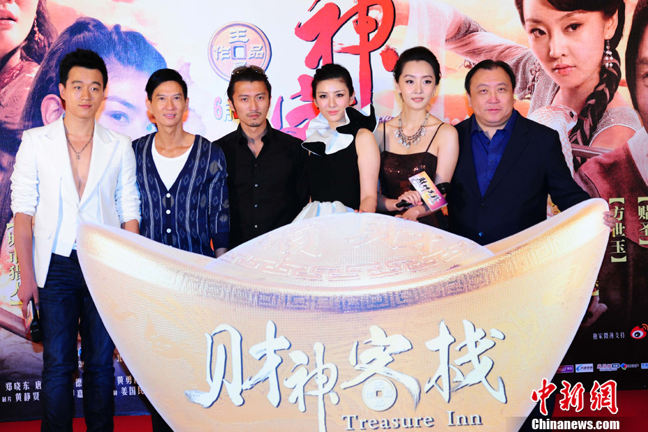 6月26日,古装喜剧《财神客栈》在京举行首映发布会。导演王晶携主演谢霆锋、张家辉、佟大为、黄奕、刘洋出席。在发布会上,谢霆锋首次面对媒体交代婚变事件,表示仍爱张柏芝。谢霆锋的出演令《财神客栈》倍受媒体关注。图为主创合影。中新社发 李学仕 摄