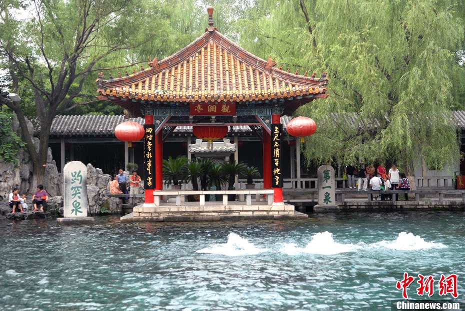 济南·趵突泉——趵突泉公园位于济南市中心,公园面积158亩,是以泉为主的特色园林。趵突泉又叫槛泉,是泺水的源头,如今已有二千七百年的历史。“趵突泉,三窟并发,声如隐雷”,“泉源上奋,水涌若轮”。泉水一年四季恒定在摄氏18度左右,严冬,水面上水气袅袅,薄雾冥冥,一边泉池波光粼粼,一边是亭台楼阁,金壁煌煌,构成了一幅奇妙的人间仙境。历代著名文学家、哲学家、诗人诸如曾巩、苏轼、张养浩、王守仁、蒲松龄等都有吟泉都忍不住在此留下美文以志之。图为2010年9月24日,济南趵突泉泉水欢涌。中新社发 崔鹏森 摄