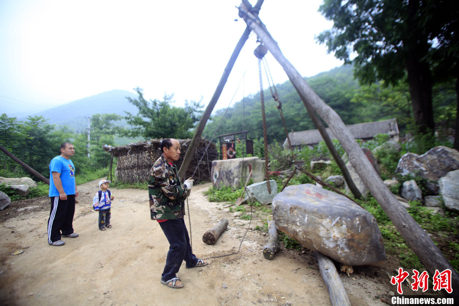 7月7日,盛产岫岩透闪石河磨玉的细玉沟里一户村民,正在门前搬运采集到的一块岫岩透闪石河磨玉玉料。专家介绍说,河磨玉是岫岩玉中最为珍贵、价值最高的玉种,从目前情况看,岫岩透闪石河磨玉是当今中国最珍贵、最稀缺的玉石资源。中新社发 孙自法 摄
