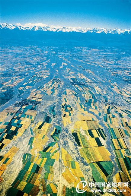 天山山脉南侧,面对毫无屏蔽遮挡的塔克拉玛干大沙漠,山口洪积扇往往规模巨大。洪积扇前端的肥沃土壤,再加上其特殊的储水特性,成就了雪山脚下的万顷良田。由于洪积扇的地下水流走向往往与扇体表面的干涸河道流向一致,因此为了方便灌溉,这里的农田也保持着与扇体和水系相同的排列方向。李翔 摄 图片来源:中国国家地理网