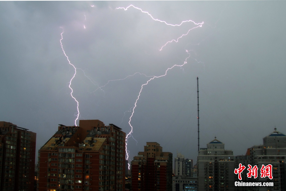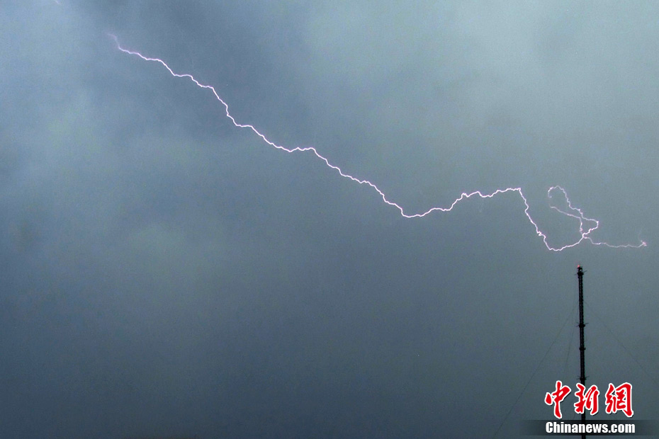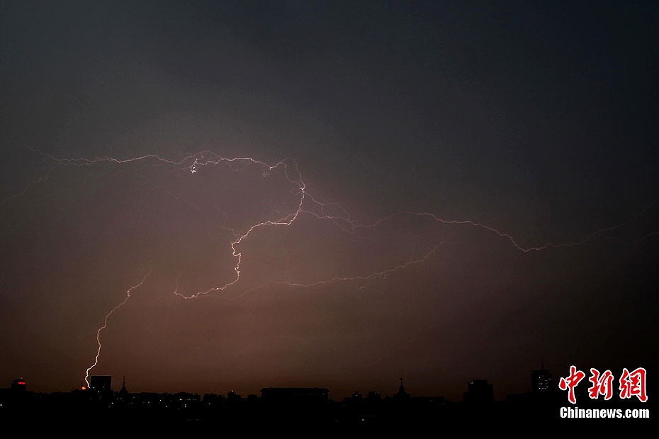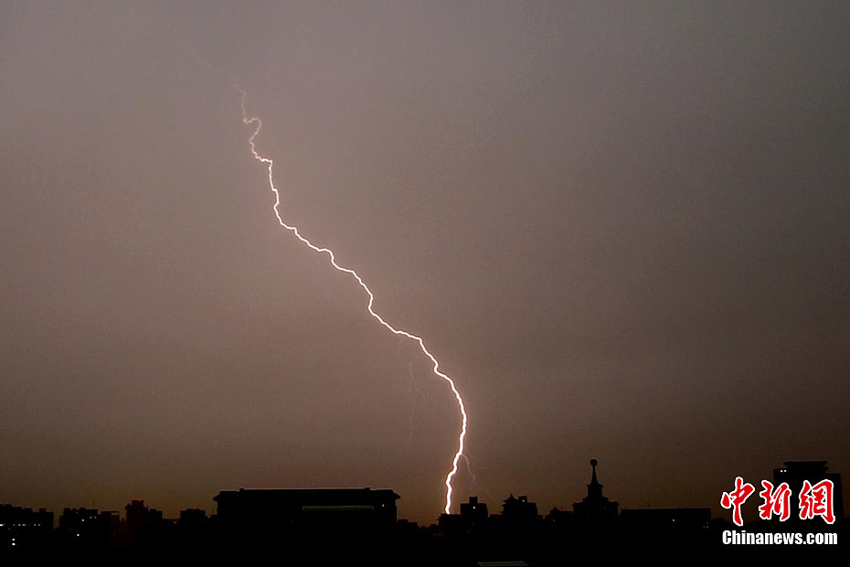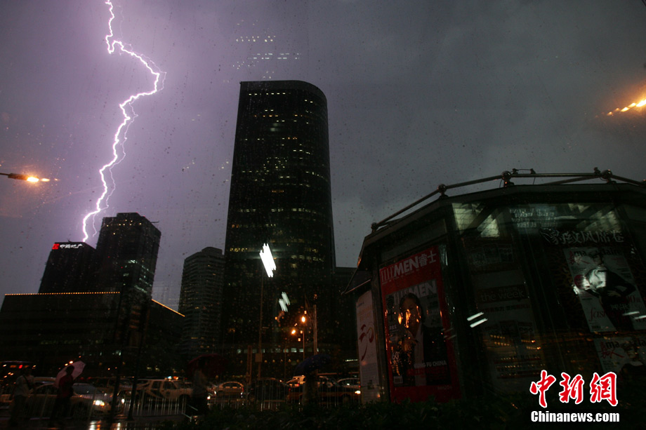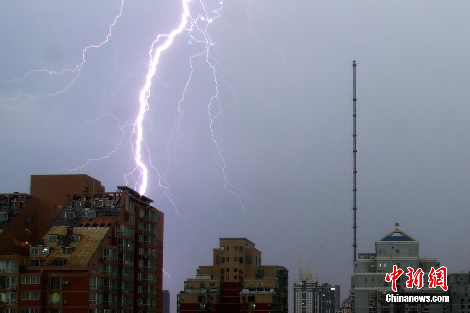 8月9日晚,一道闪电击中位于北京西三环附近的中央电视塔。当晚,北京城区遭遇雷暴袭击,短时强降雨给市区交通造成较大影响。中新社发 张炜 摄