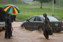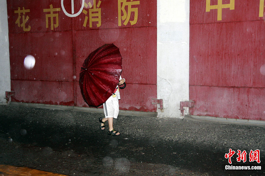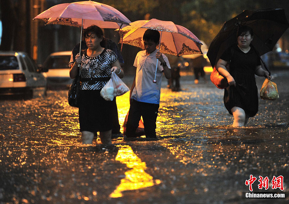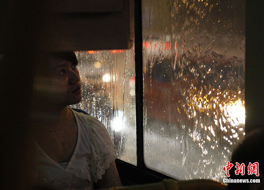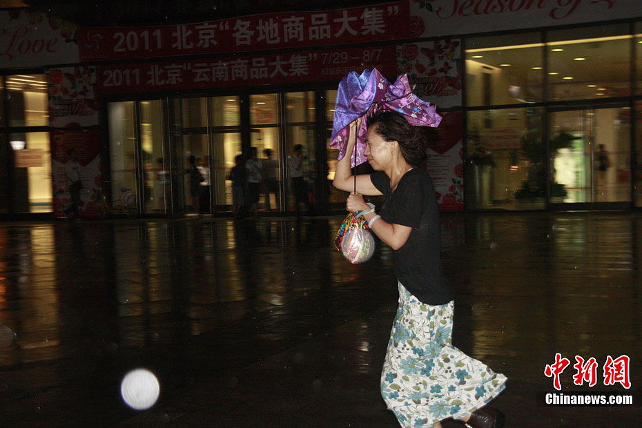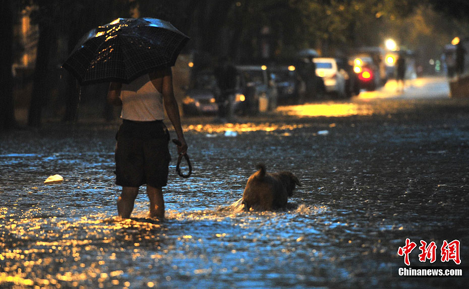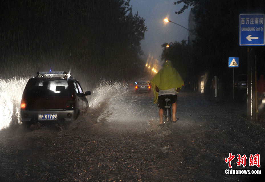 8月9日晚,一道闪电击中位于北京西三环附近的中央电视塔。当晚,北京城区遭遇雷暴袭击,短时强降雨给市区交通造成较大影响。中新社发 张炜 摄
