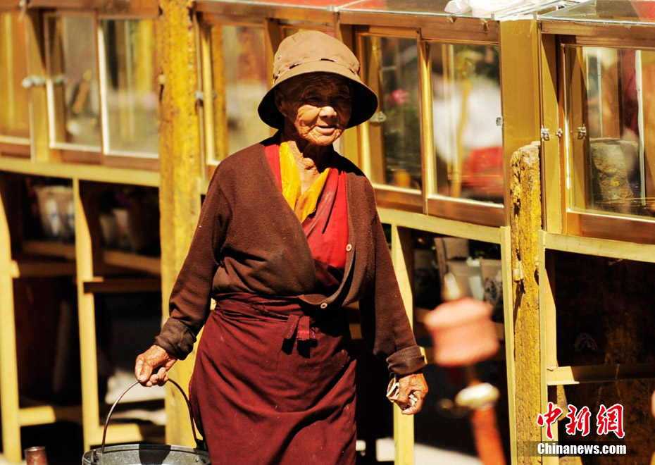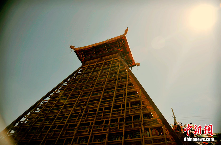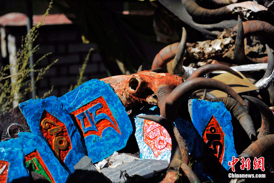 阳光下的“甘珠尔”石经塔。《甘珠尔》是藏传佛教重要经籍,“甘珠尔”石经塔是造塔人将整部《甘珠尔》经刻在石板上,并将刻有经文的石板堆砌成一座宝塔。 中新网记者 王红纲 摄
