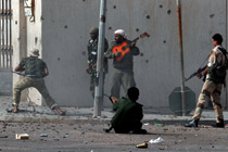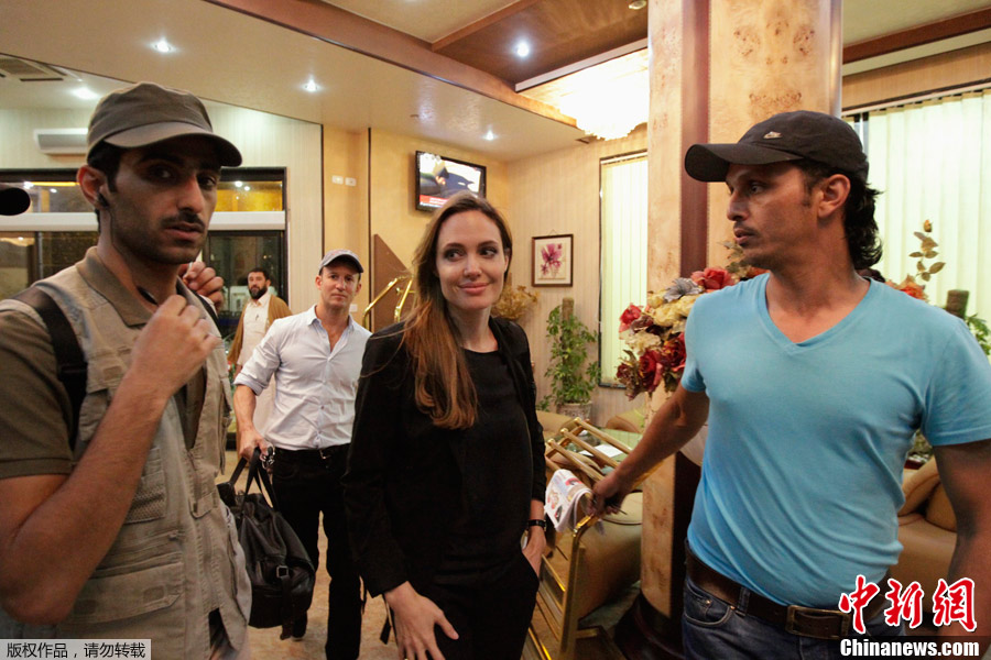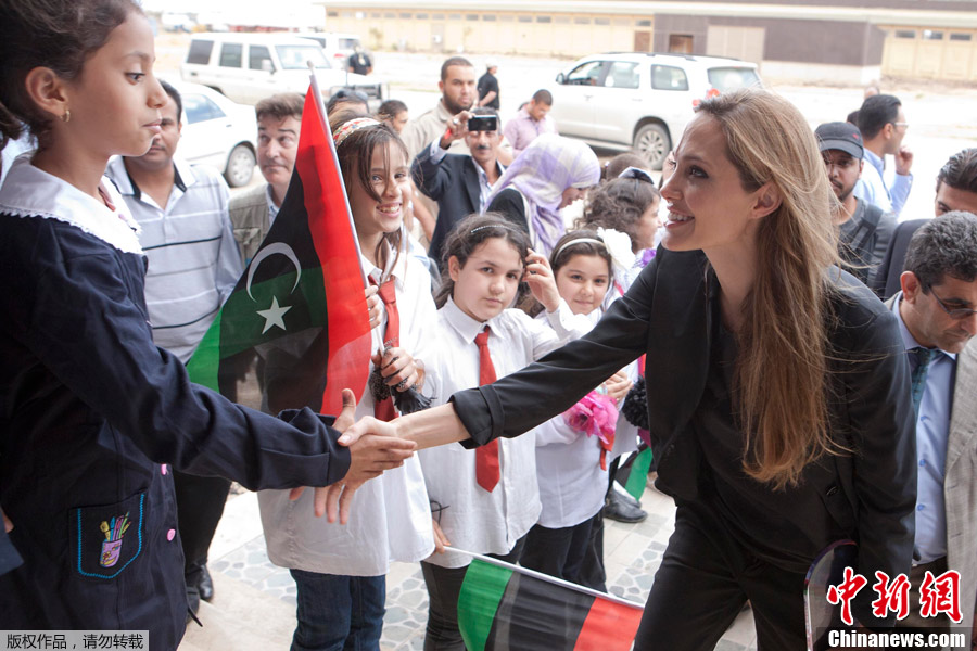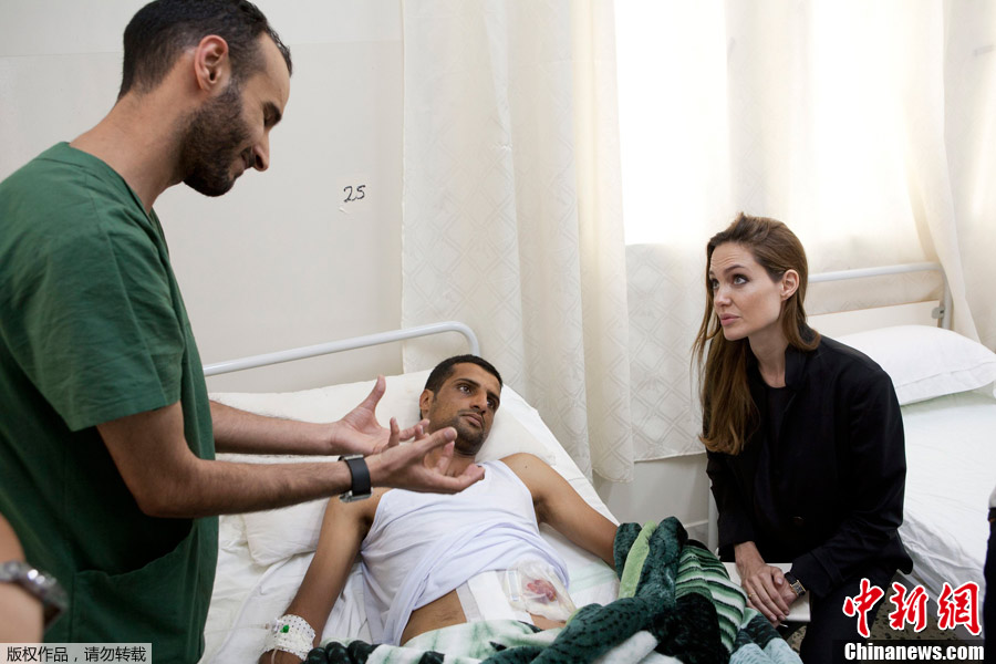 10月11日,美国女影星、联合国亲善大使安吉丽娜·朱莉造访利比亚,协助国际机构向的黎波里和米苏拉塔提供援助。朱莉表示,利比亚此刻正面临一系列的挑战,包括安置难民、维护法治和安全以及保障人们教育和医疗等基本权利等问题。图为安吉丽娜·朱莉在米苏拉塔某医院看望政府军伤员。