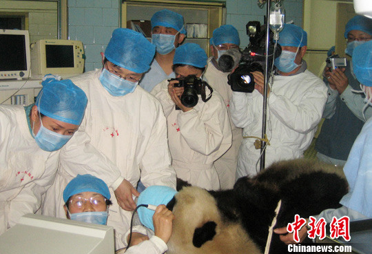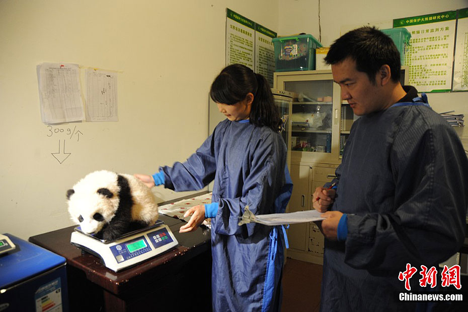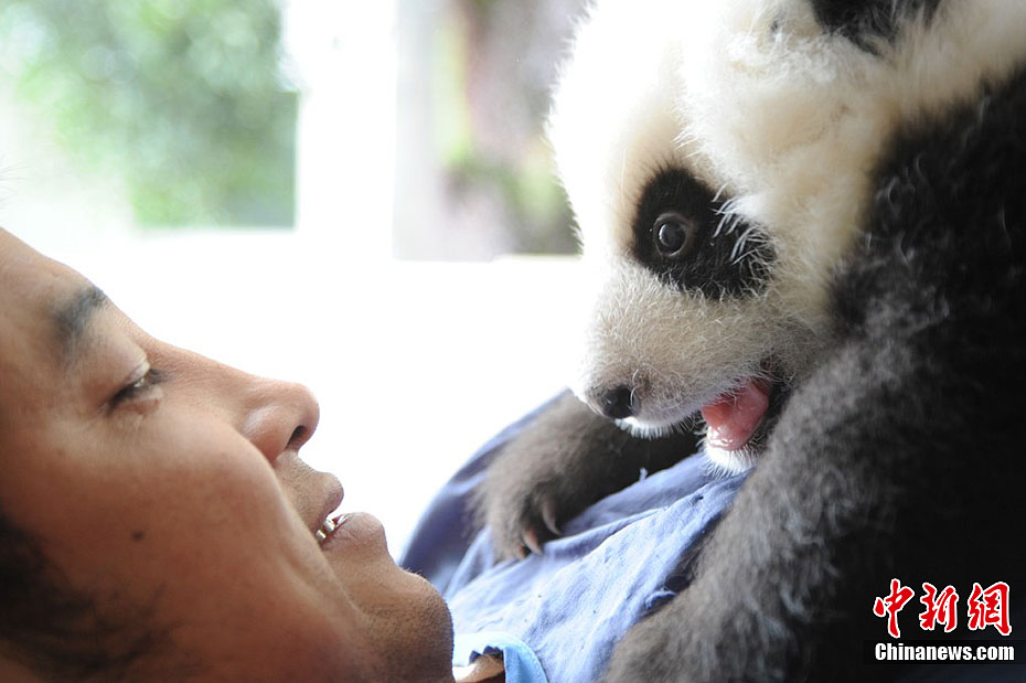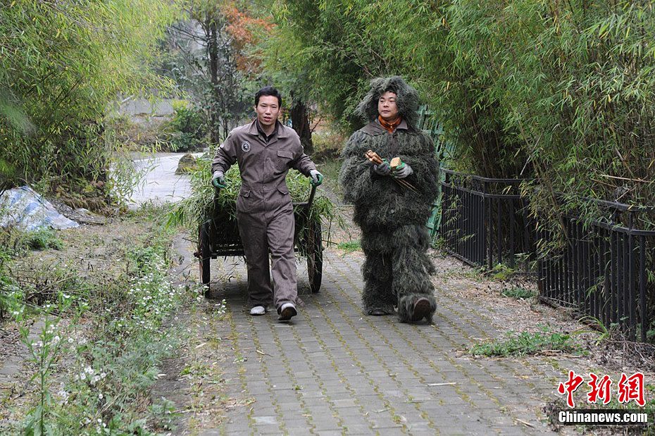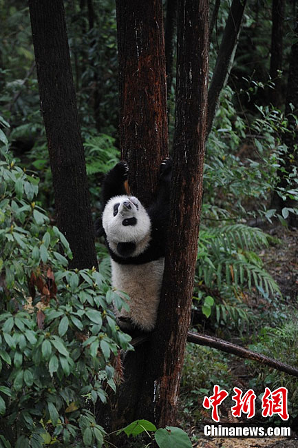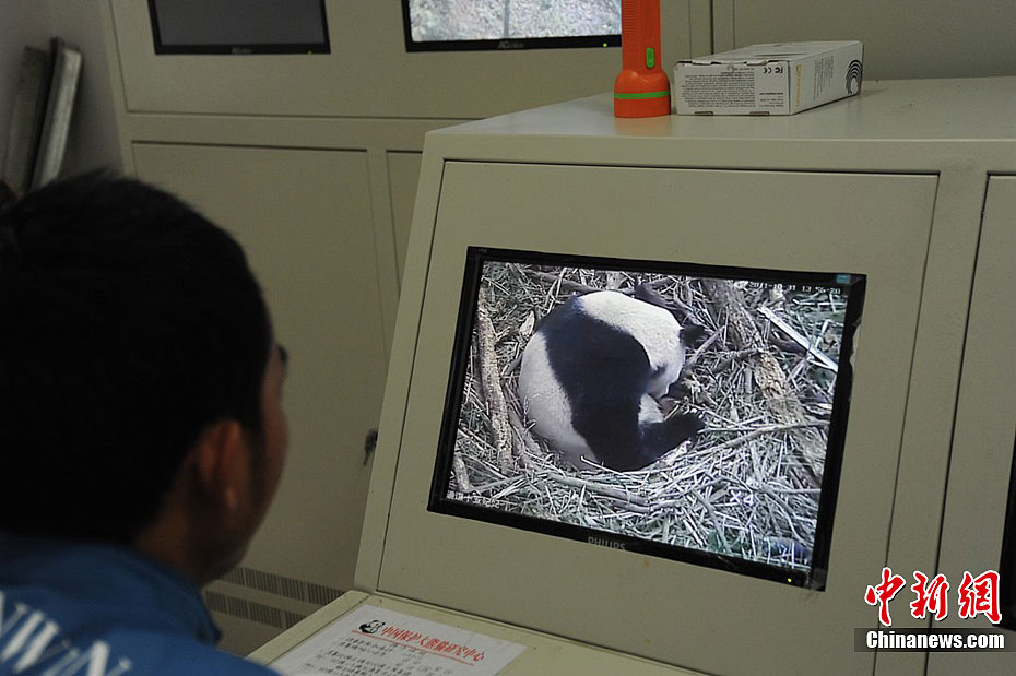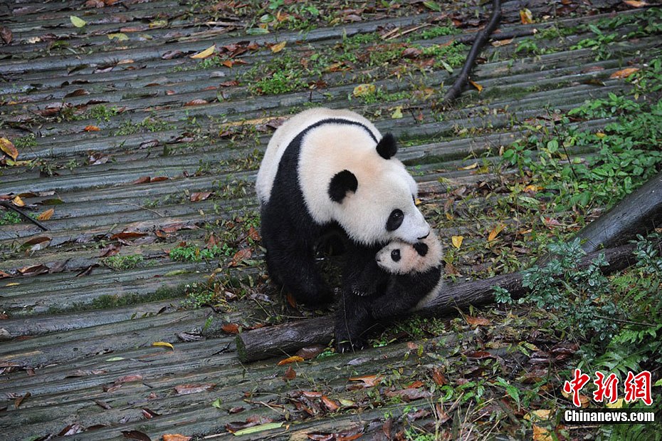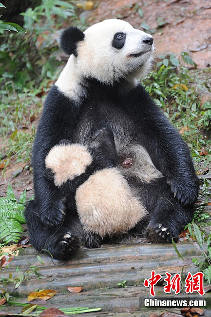 在四川雅安碧峰峡基地半野化环境中产下双胞胎幼仔的“张卡”,正在半野化环境中抚育幼崽。中国保护大熊猫研究中心大熊猫妃妃10月31日在半野化环境中顺利产仔,至此该研究中心今年共产仔5胎7仔,其中大部分将参与到圈养大熊猫野化培训与放归研究中,同时也标志着2011年大熊猫野化放归研究对象初步确定。中新社发 罗小韵 摄