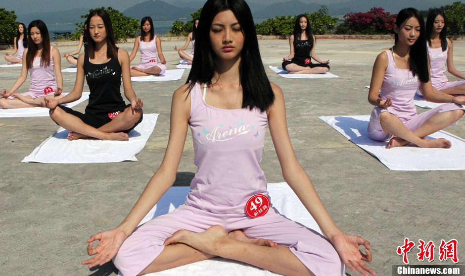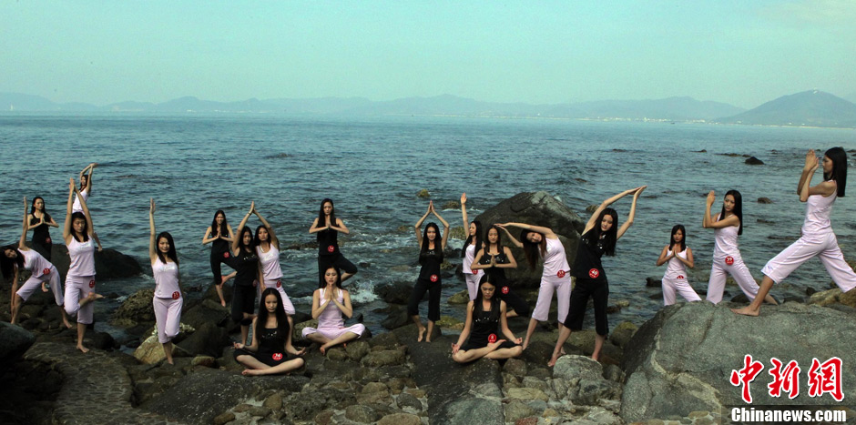12月4日,正在海南三亚参加第19届新丝路中国模特大赛总决赛的佳丽,来到美丽的西岛景区游览拍摄。图为众佳丽在海边练习瑜伽健身。中新社发 钱兴强 摄