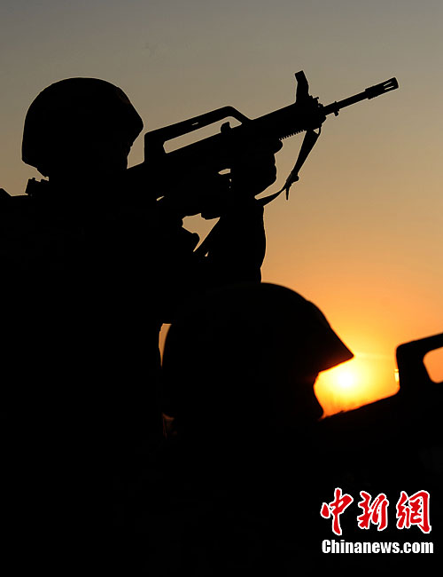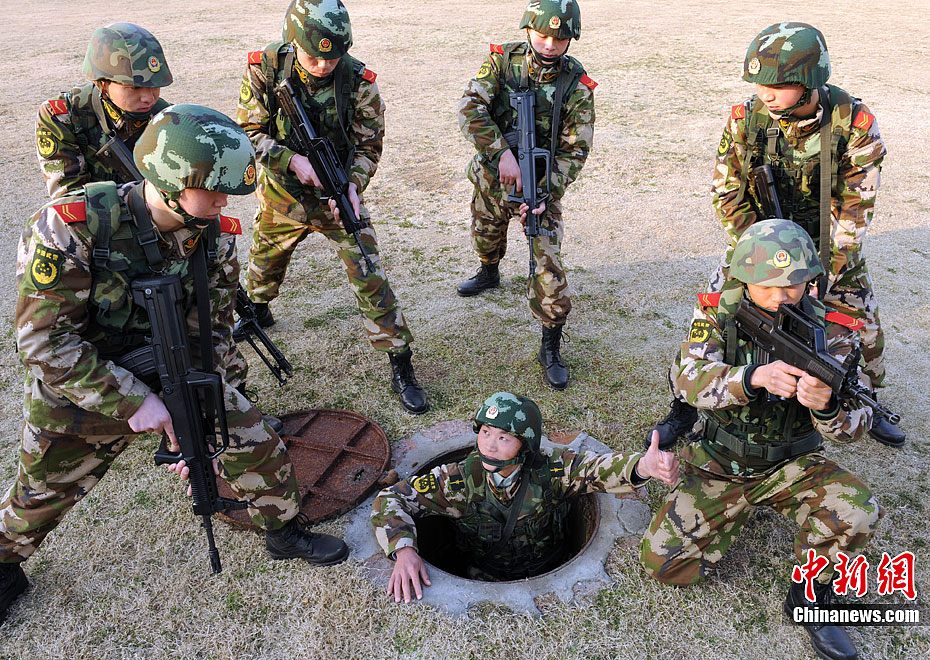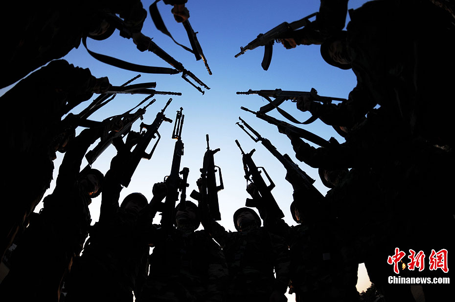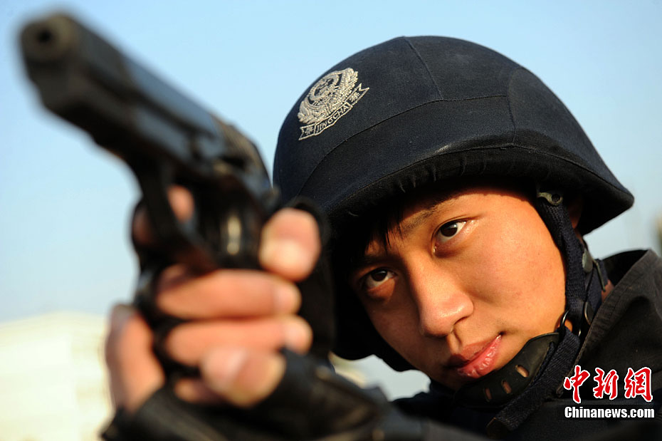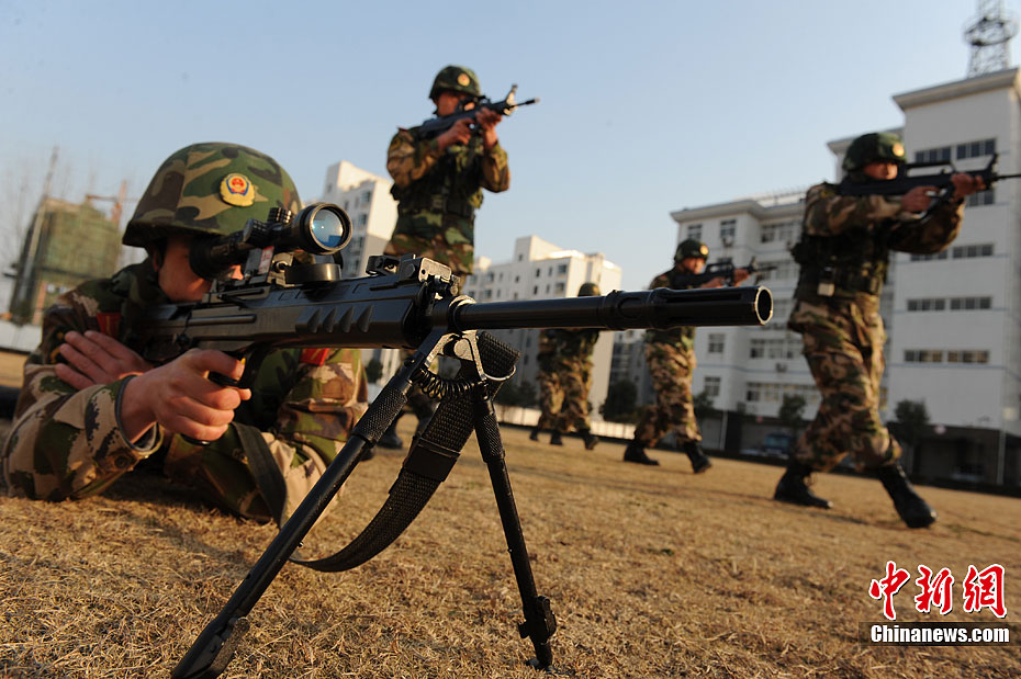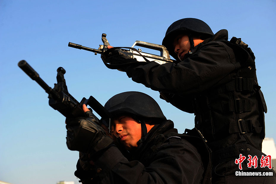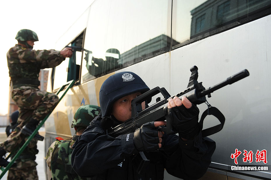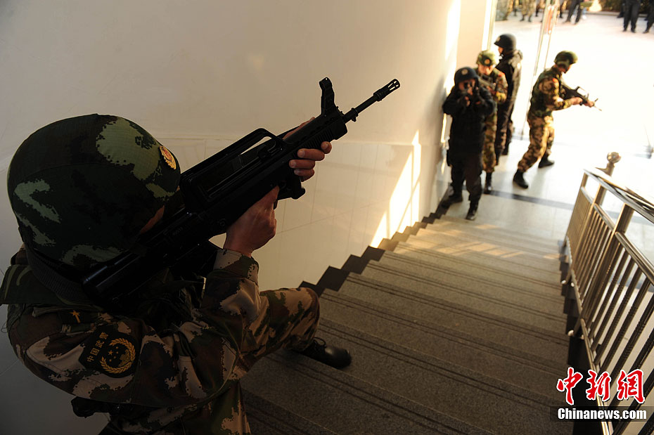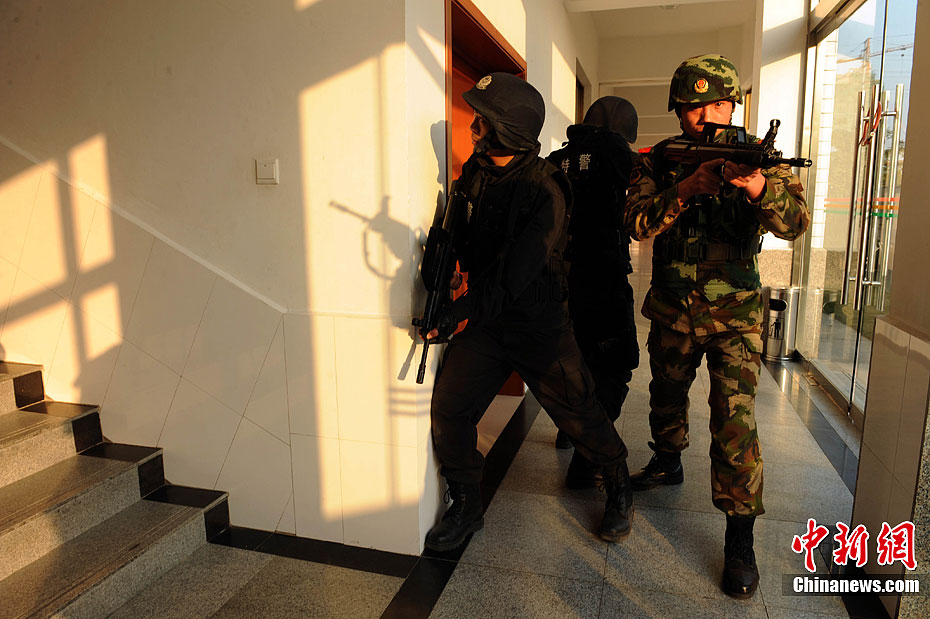 12月15日,公安特警和武警战士正在进行联合举行反恐应急演练。当日,安徽省亳州市公安特警支队和武警支队联合举行处置群体性暴力事件暨反恐演练,以适应新形势下反恐斗争的需要。此次联合反恐演练坚持高标准、严要求的反恐力量建设,全面提高各警种和各职能部门处置应急突发性事件的战斗配合能力,有效维护社会的繁荣稳定。中新社发 张延林 摄 图片来源:CNSPHOTO