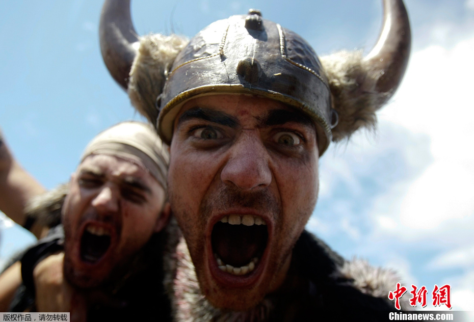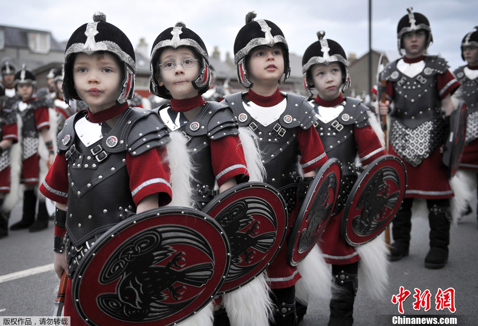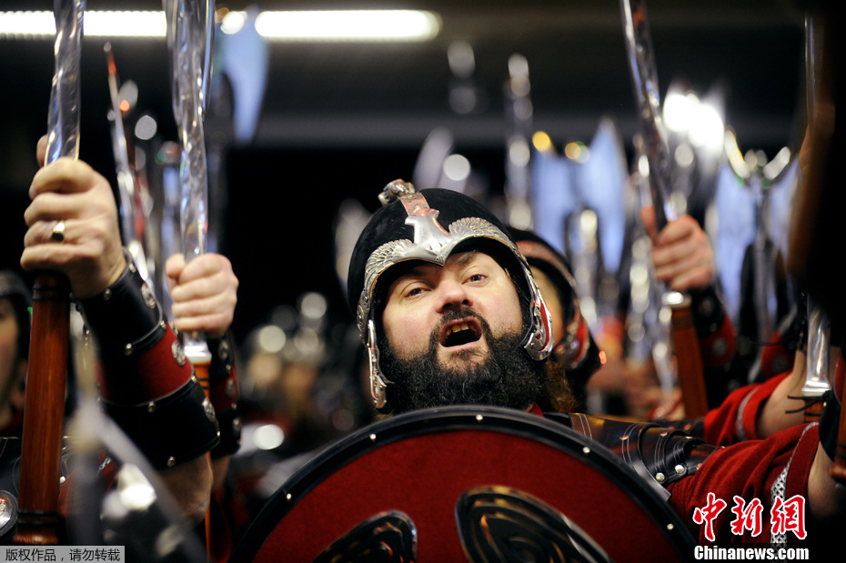 1月31日,在英国北部设得兰群岛的勒威克,人们装扮成海盗参加火祭(Up Helly Aa)。一年一度的火祭是设得兰群岛最盛大的节日,每年1月的最后一个星期二举行,节日的高潮是焚烧一条海盗船。