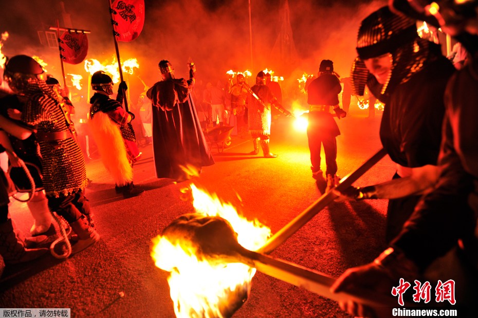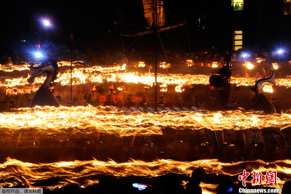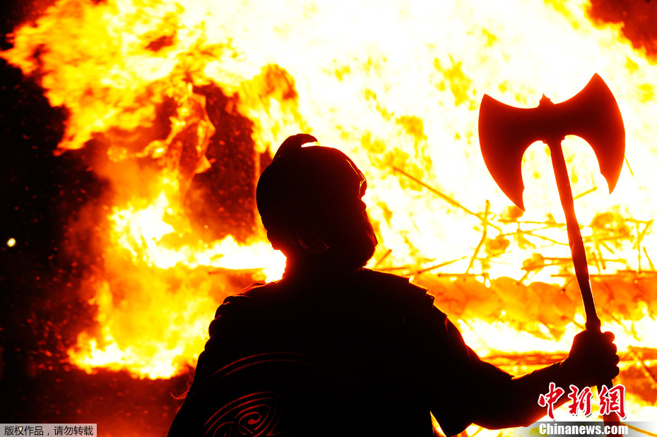 英国庆祝维京火祭节 火光冲天照亮夜空