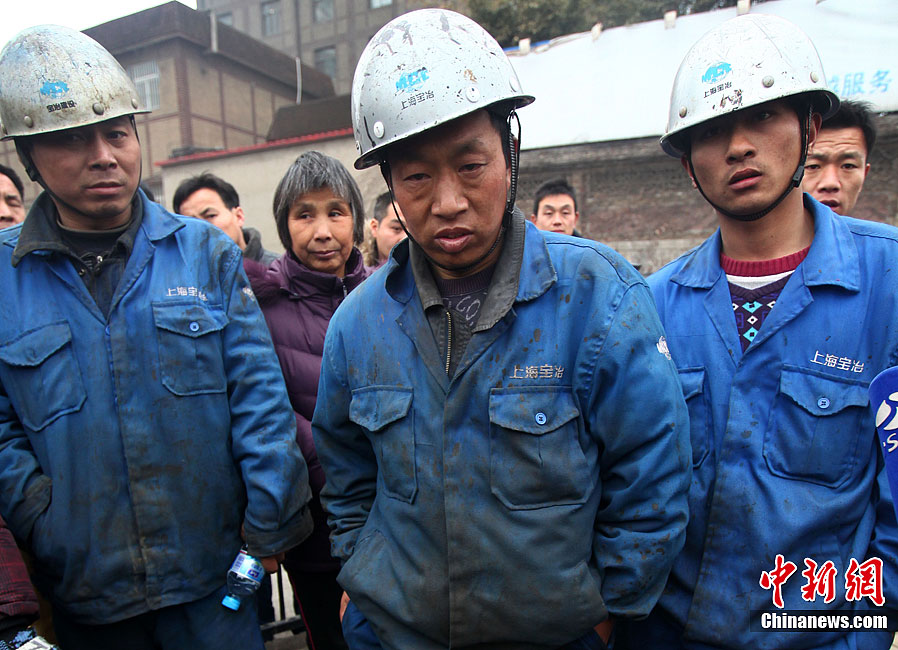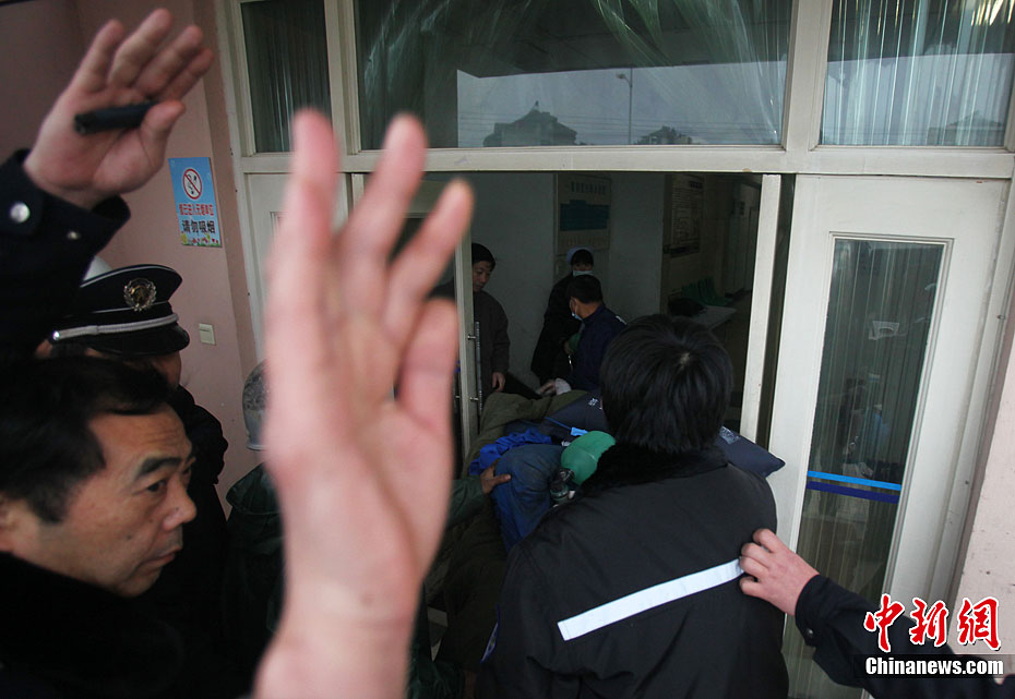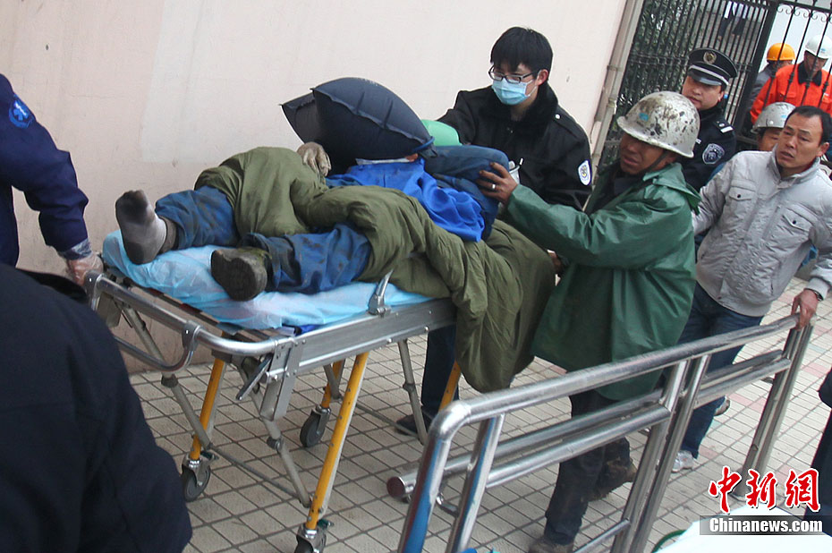 2月23日中午11:50分左右,上海梅山钢铁公司进行煤气三加压站(8万立方米气柜)技术改造大修,施工方宝冶建设南京分公司在施工过程中,致转炉煤气倒灌进煤气柜,造成柜内13名作业人员中毒。其中3人经抢救无效死亡,3人重伤正在全力抢救中,7人已出高压氧舱脱离生命危险。图为伤员被送到医院救治。钱伟 摄