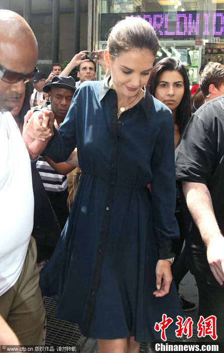 当地时间7月2日,纽约,凯蒂·赫尔姆斯(Katie Holmes )结束《天之骄子》(Project Runway)录像后离开帕森斯设计学院。一身深蓝色套裙的她,虽面对镜头仍带着微笑,但是看起来笑得十分勉强。另外,凯蒂·赫尔姆斯已经将左手无名指婚戒取下。图片来源:CFP视觉中国