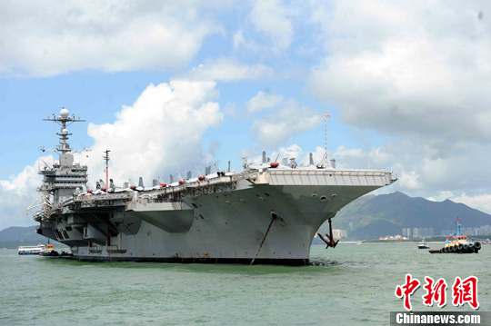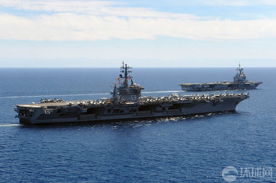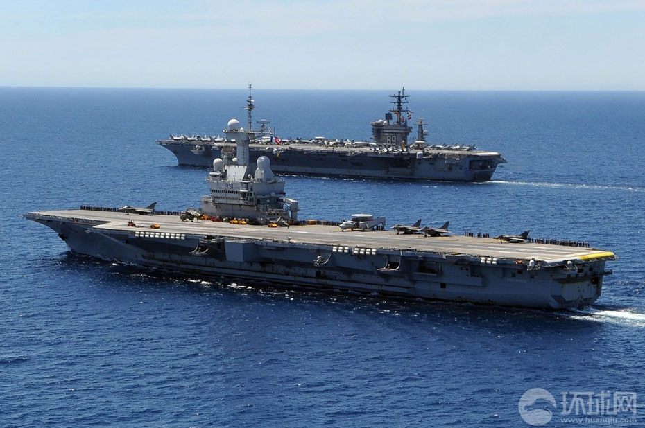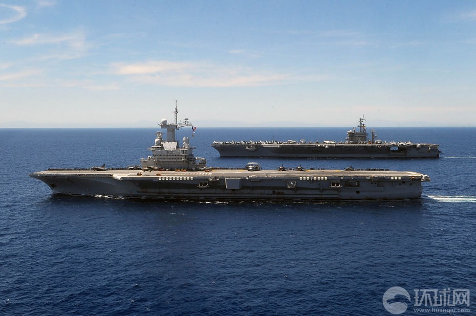 美国海军核动力航母艾森豪威尔号和法国海军的戴高乐号航空母舰在地中海进行了联合机降演练。图为法国戴高乐号核动力航母。图片来源:环球网