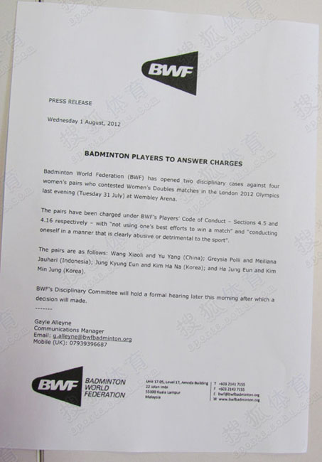 中国体育代表团充分尊重世界羽联处罚决定。中国体育代表团1日表示充分尊重世界羽联对中国羽毛球运动员于洋/王晓理的处罚决定。中国体育代表团新闻发言人说,于洋/王晓理赛场上的这种行为违背了奥林匹克运动的宗旨和体育公平竞争的精神,中国体育代表团对此感到痛心,并坚决反对、严厉批评这种行为。中国奥委会历来反对任何人、任何队伍、任何形式的违反体育精神和体育道德的做法。该新闻发言人说,目前代表团正在对有关人员进行调查,将根据调查结果做出相应处理,同时强调各参赛队伍要继续弘扬奥林匹克精神,维护奥林匹克宗旨,维护中国体育代表团的荣誉,为伦敦奥运会成功举办和奥林匹克运动发展做出贡献。图片来源:新华网