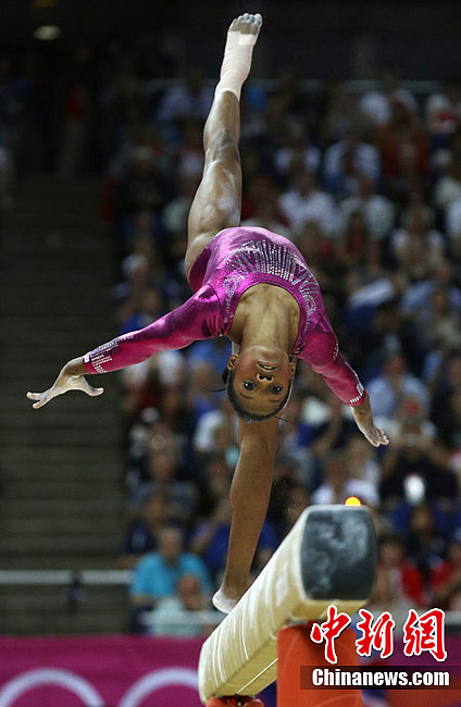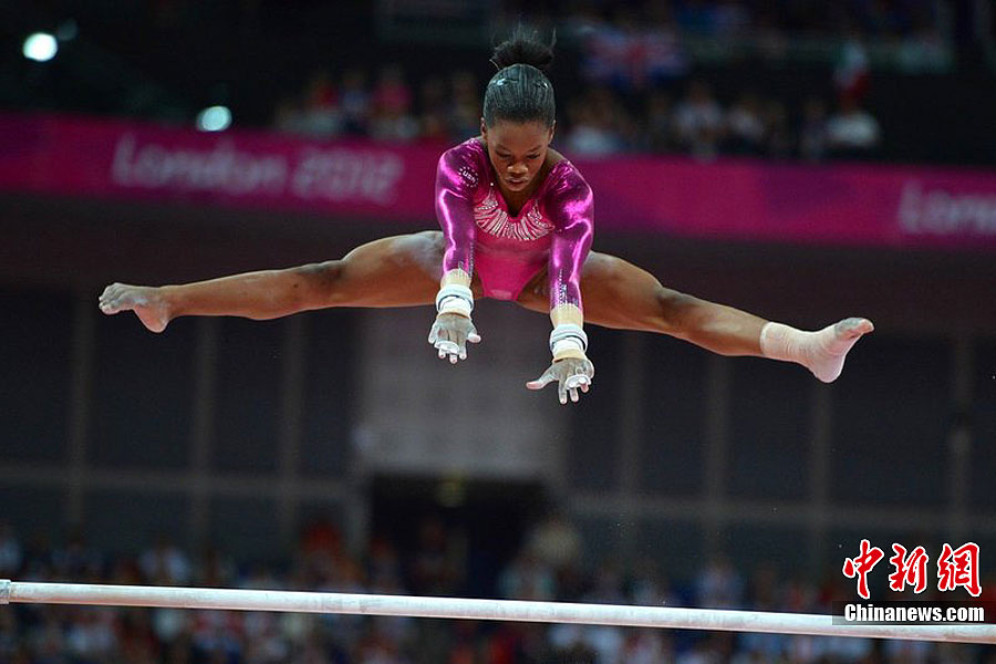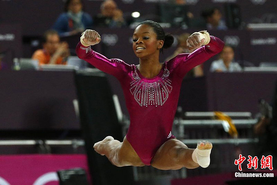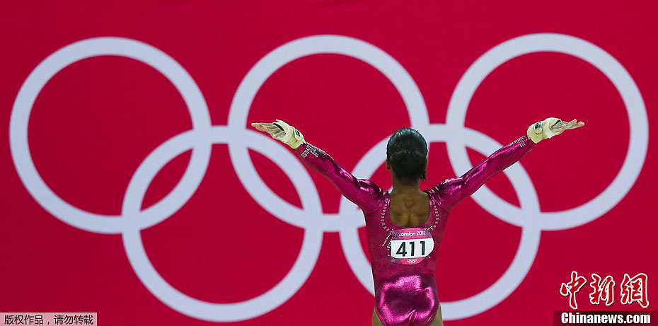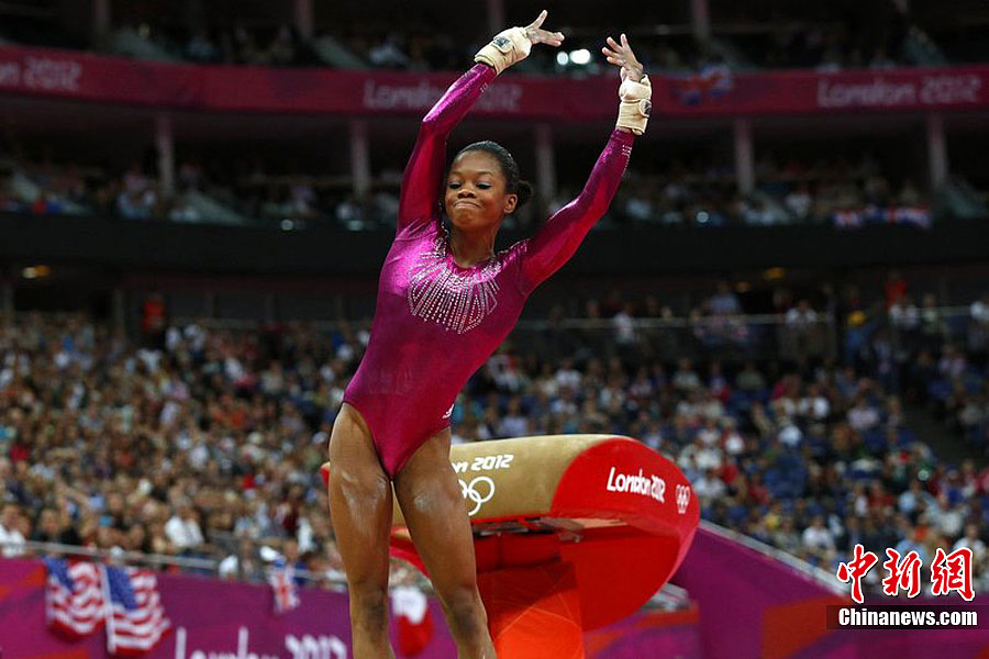 当地时间8月2日,伦敦奥运女子体操全能比赛在北格林威治体育馆举行,美国选手道格拉斯夺取冠军,成为首位夺取女子体操全能金牌的黑人选手。图为美国选手道格拉斯。图片来源:东方IC 版权作品 请勿转载