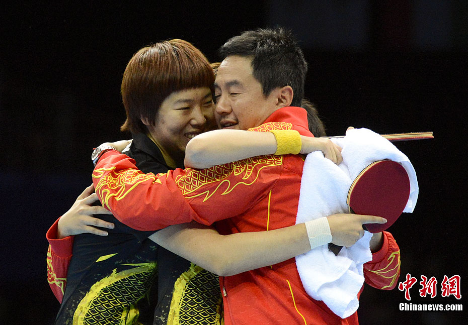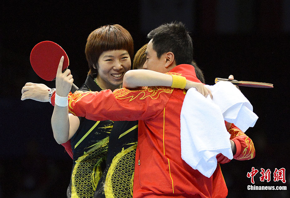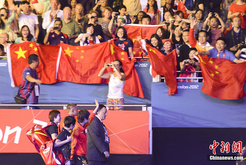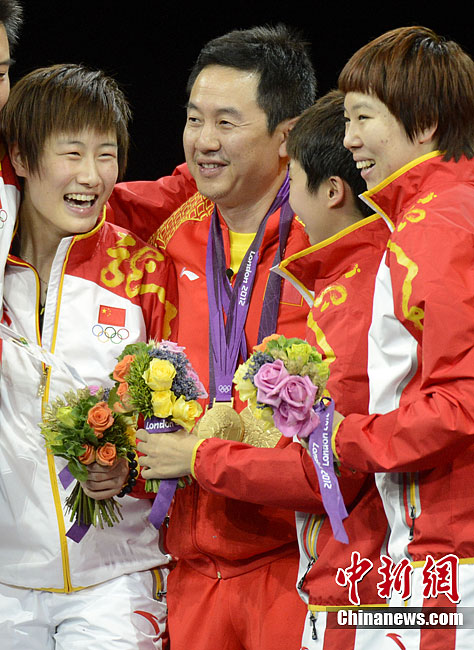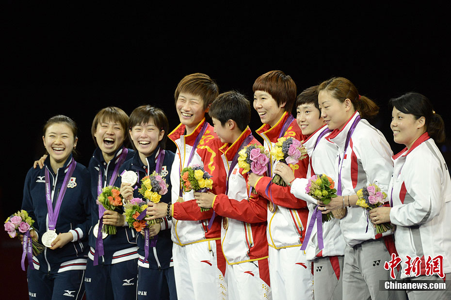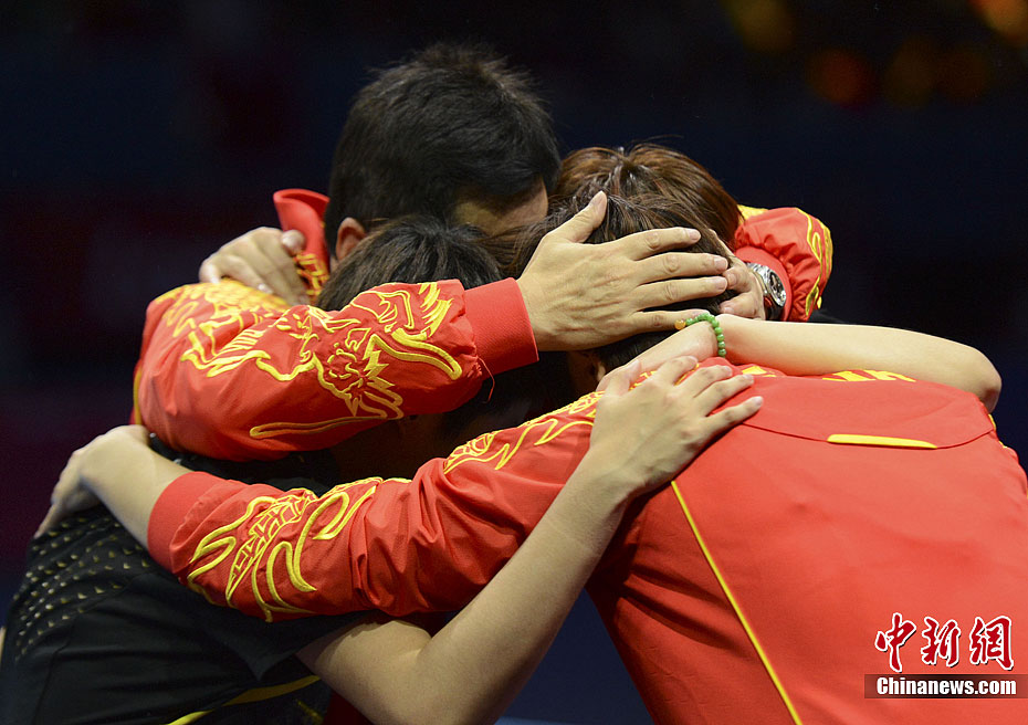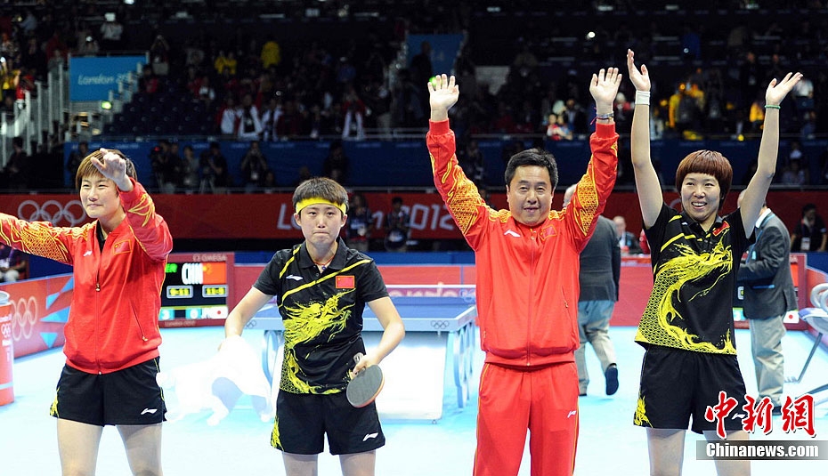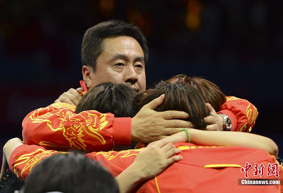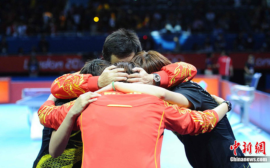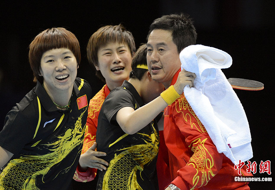 当地时间8月7日,伦敦奥运女乒团体决赛,中国3-0横扫日本夺冠,其中李晓霞3-1福原爱,丁宁3-0击败石川佳纯,郭跃/李晓霞3-1平野早矢香/石川佳纯,收获第34金。图为中国队庆祝胜利。记者 廖攀 摄