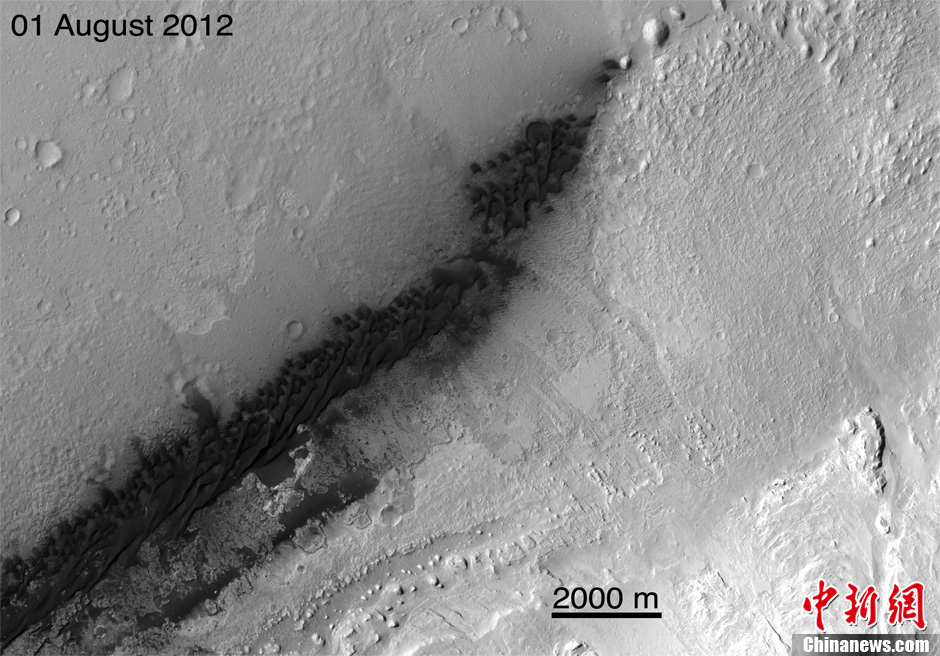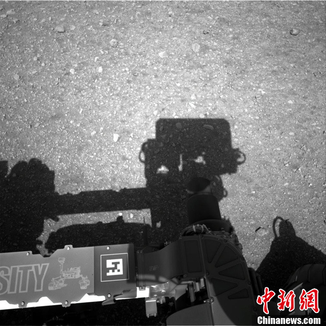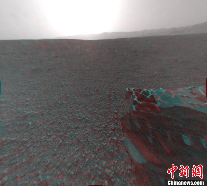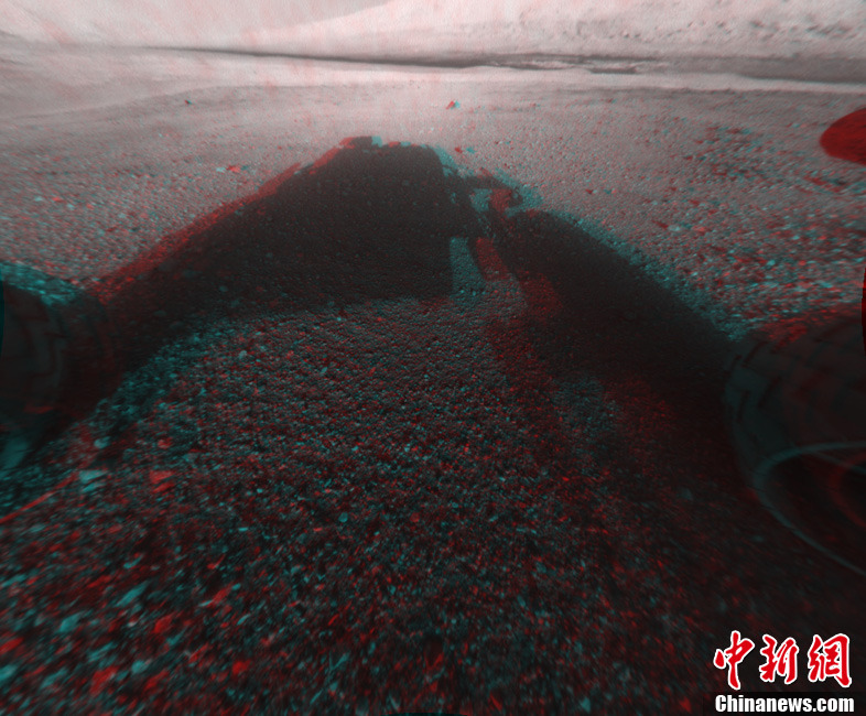 “好奇号”拍摄的3D图片已经传回地球,它展现了该登陆器的轮子和它在火星表面投下的阴影。该图是由位于火星车前面的一对立体避险相机捕捉到的。美国“好奇号”火星探测器于北京时间8月6日在火星成功着陆。图片来源:NASA