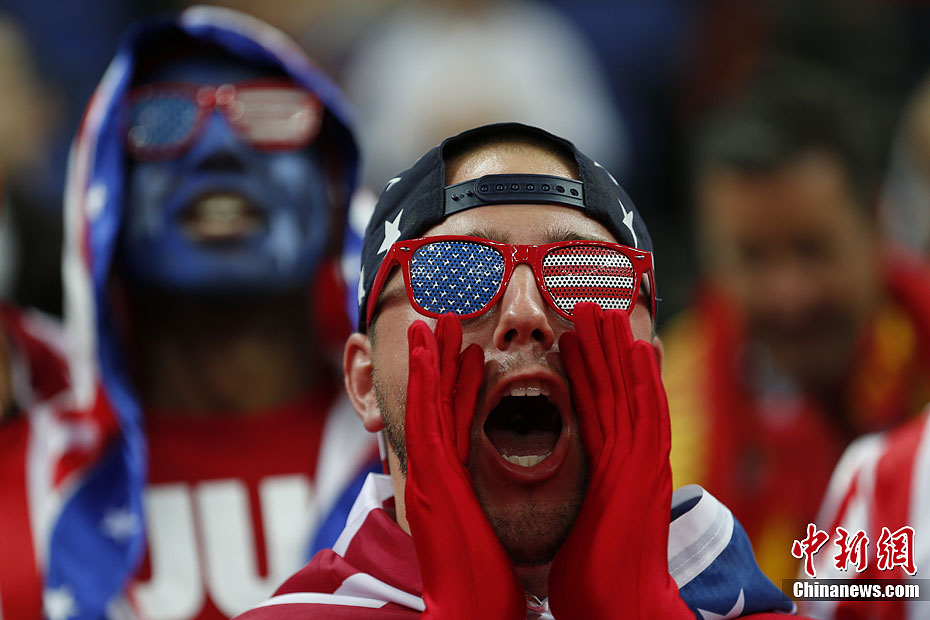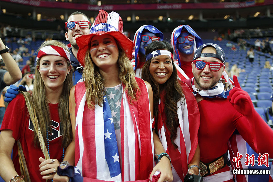 当地时间8月12日,2012伦敦奥运会男子篮球决赛在北格林威治体育馆进行,美国队(白)最终战胜西班牙队夺冠。图为奥运男篮决赛现场的球迷。记者 盛佳鹏 摄
