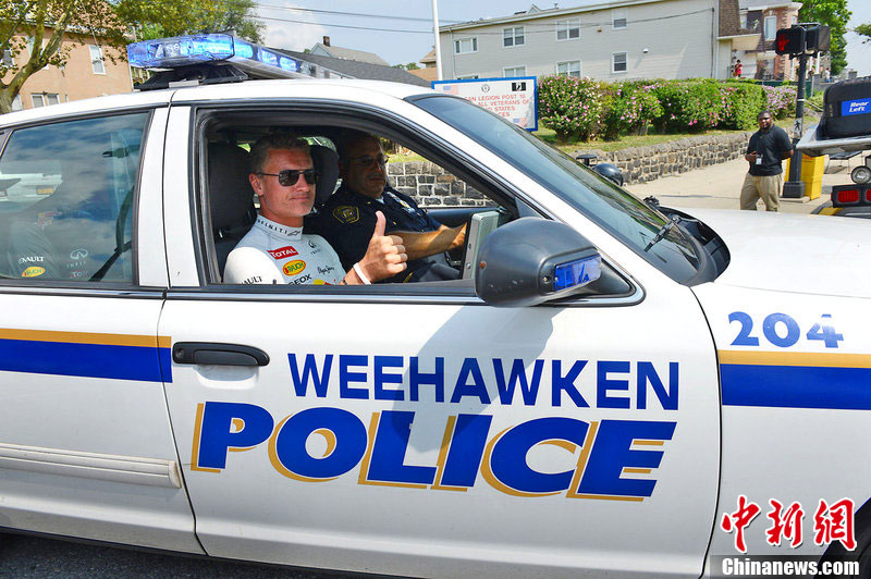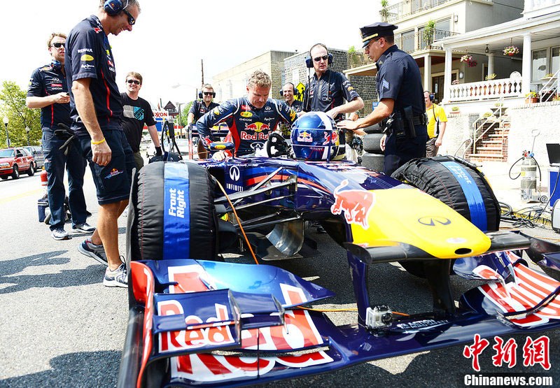 当地时间8月16日,前F1车手库特哈德亮相纽约,准备驾驶F1红牛车队座驾来一场“街头狂飙”,当地警察前来“护驾”,霸气十足。图片来源:东方IC 版权作品 请勿转载