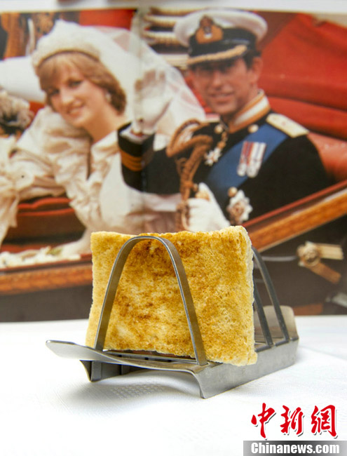 拍卖查尔斯王子吃剩的面包:当地时间2012年7月7日,英国德比,31年前戴安娜王妃婚礼上的一块未曾被查尔斯王子品尝过的吐司定于当月19日进行拍卖。图片来源:东方IC 版权作品 请勿转载
