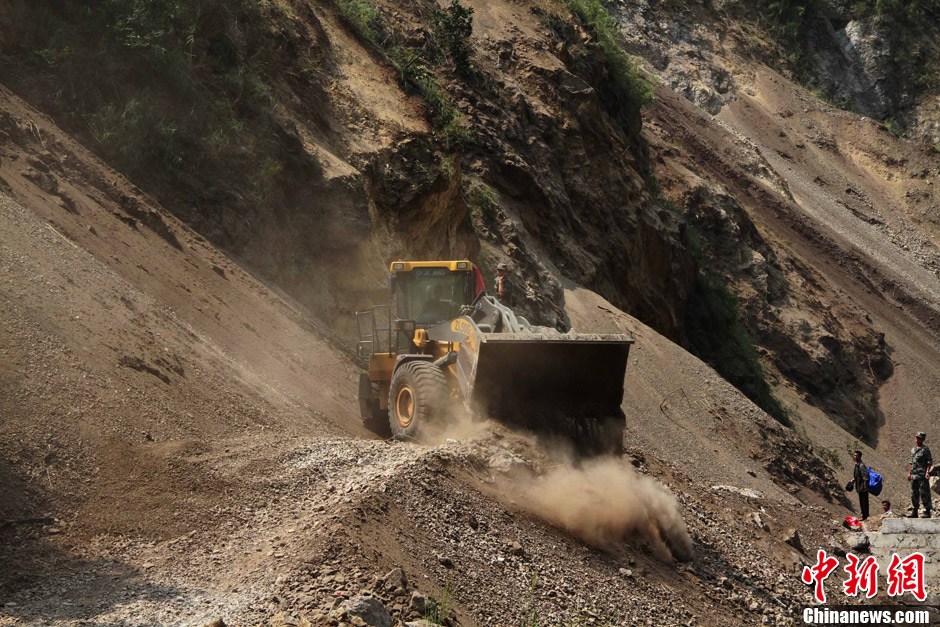 9月9日,成都军区驻渝某集团军工兵团受命抢修从石坪通往洛泽河镇的道路。参加抢修生命线的官兵大多参加赴黎维和任务,凯旋回国后又马上投入泸州50年一遇特大抗洪抢险,如今,他们又接受云南彝良抗震救灾的考验。图为救援现场。中新社发 彭小明 摄