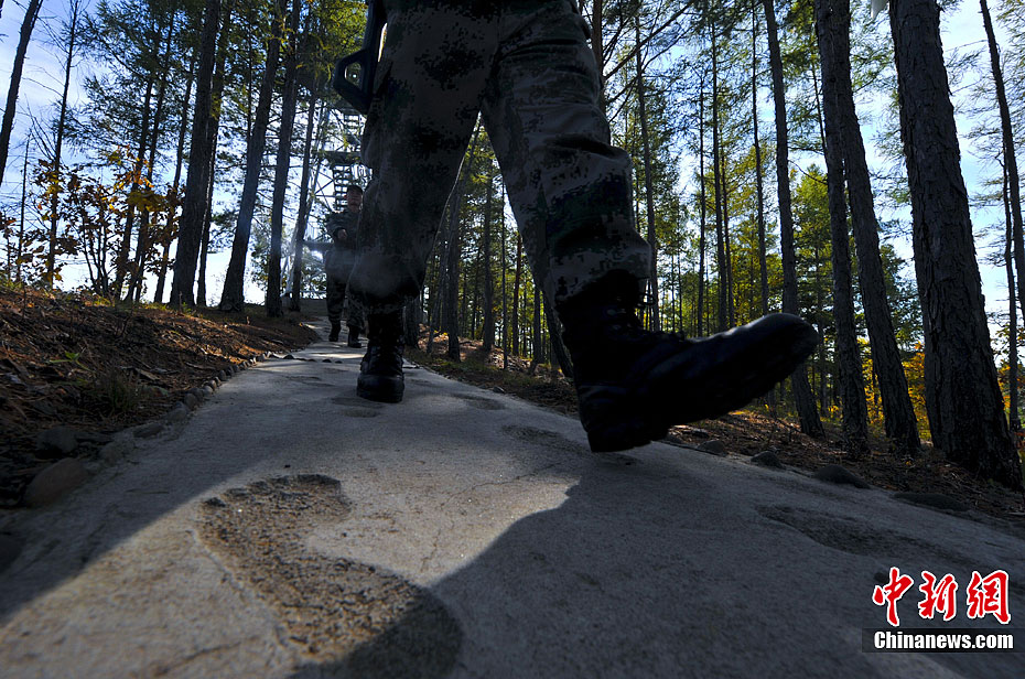 9月18日,中苏当年重兵对抗之地吴八老岛,如今由黑龙江省军区某边防团五连驻守在这景色如画的边疆。该岛因吴姓老者一家1926年开垦居住而得名。1969年5月,苏军隔界枪杀中国边防巡逻兵任九林,随即中国军队三个师与苏军两个师重兵相隔黑龙江两岸对抗,终归和解撤兵。图为哨兵走在老兵用脚印铺就的边防路上,官兵戏称为中国边疆的好莱坞金光大道。中新社发 贾国荣 摄