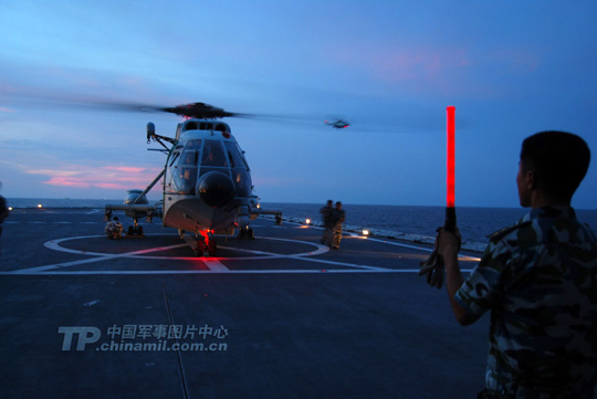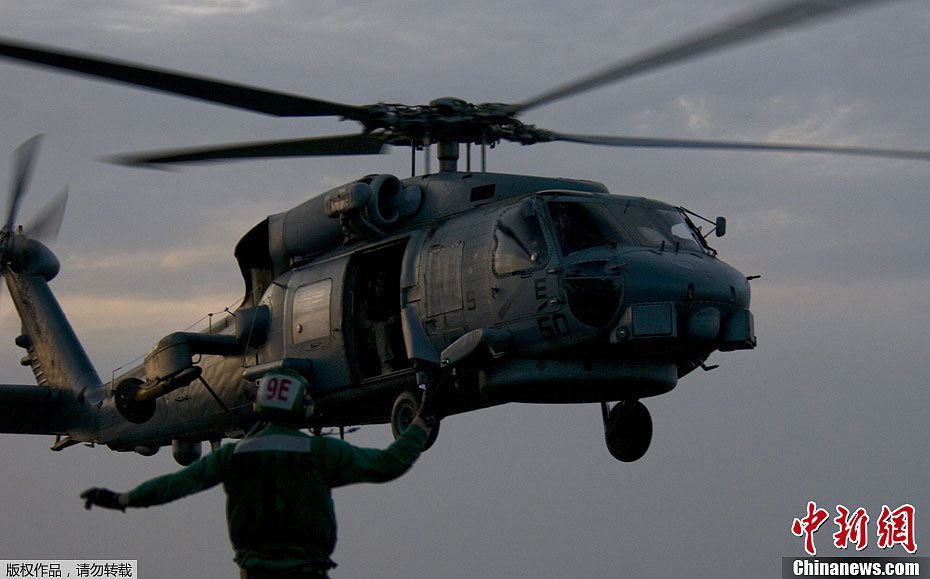 图为2011年3月5日,一名航母工作人员正在引导一架SH-60F“大洋鹰”直升机在“卡尔文森”号航母上降落。
