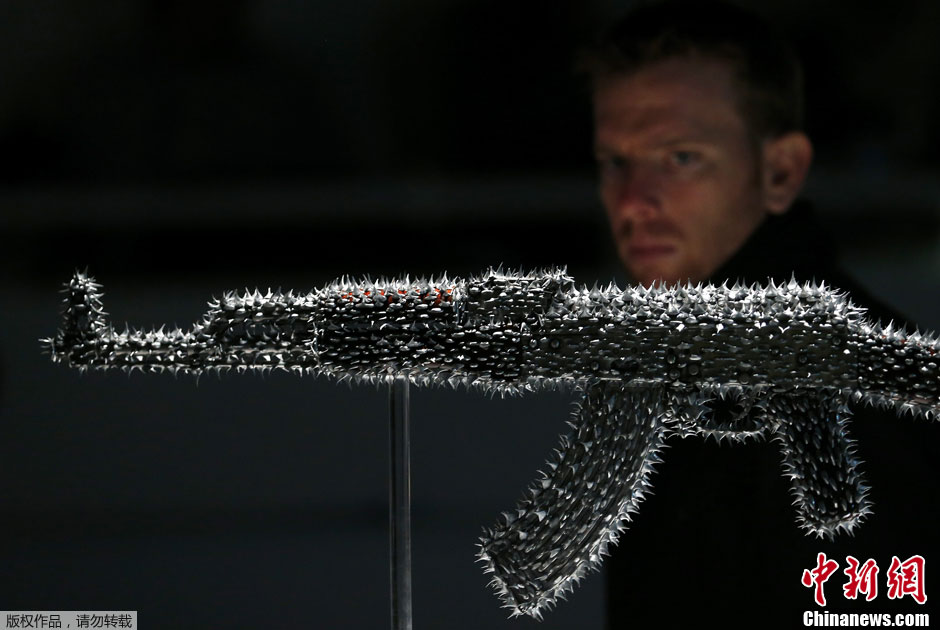当地时间9月26日,英国伦敦当代艺术学院,当代艺术家响应“为了和平之日”非盈利组织活动,为全球停战运动筹集资金,将AK47步枪进行了艺术再创作。
