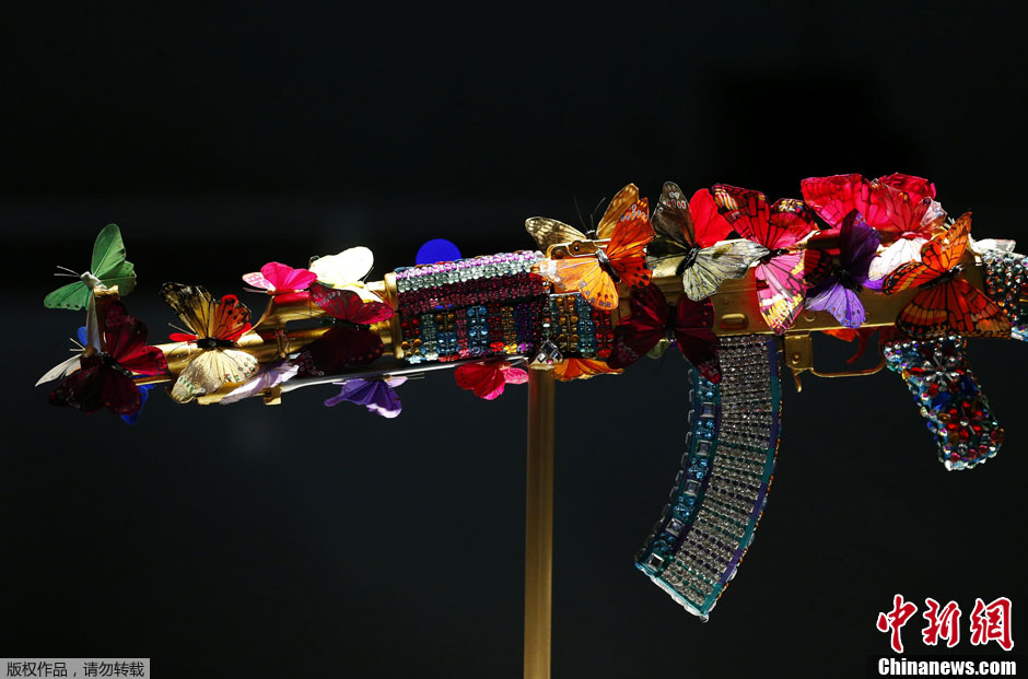 当地时间9月26日,英国伦敦当代艺术学院,当代艺术家响应“为了和平之日”非盈利组织活动,为全球停战运动筹集资金,将AK47步枪进行了艺术再创作。