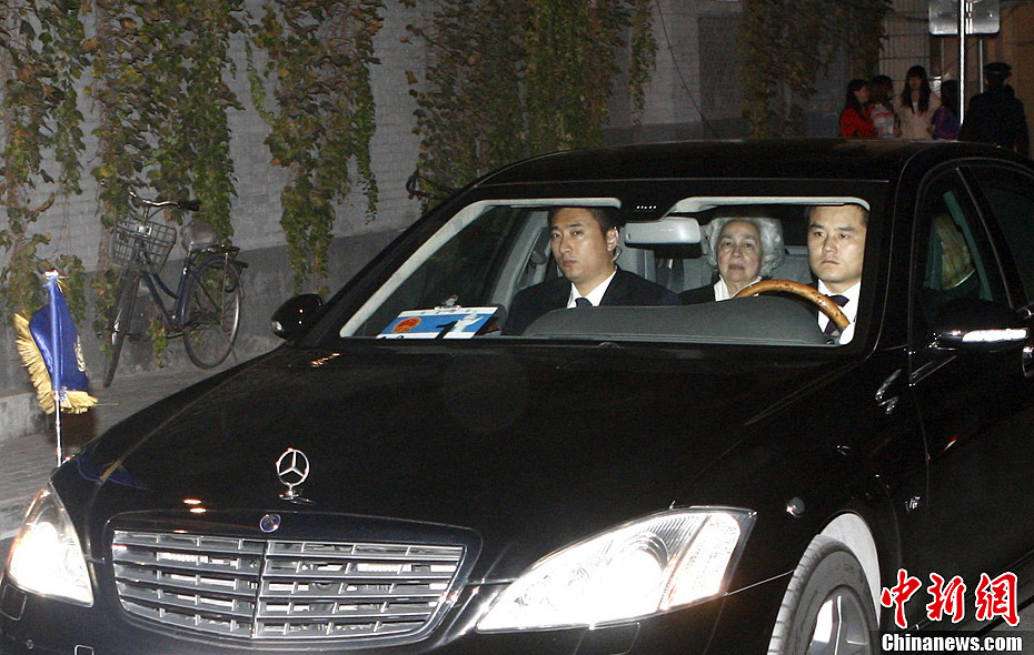 10月15日,柬埔寨太后诺罗敦·莫尼列·西哈努克(后左)与柬埔寨国王西哈莫尼(后右)乘车进入北京医院。柬埔寨国王西哈莫尼、首相洪森等当日乘专机抵达北京,前来迎请在北京逝世的柬埔寨太皇西哈努克的灵柩返回柬埔寨。柬埔寨前国王诺罗敦·西哈努克于北京时间15日凌晨2时20分左右在北京医院逝世。中新社发 张浩 摄