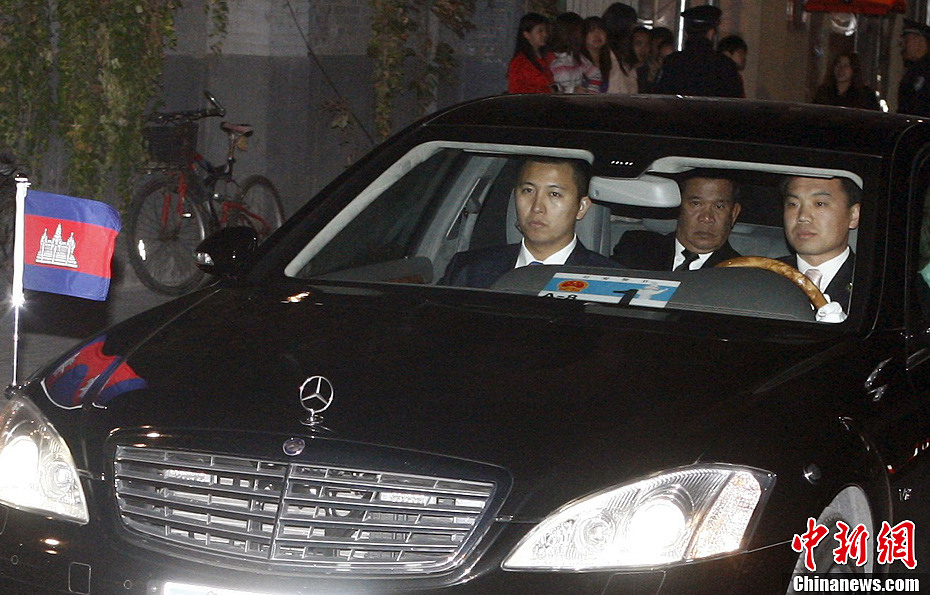 10月15日,柬埔寨首相洪森(后中)乘车进入北京医院。柬埔寨国王西哈莫尼、首相洪森等当日乘专机抵达北京,前来迎请在北京逝世的柬埔寨太皇西哈努克的灵柩返回柬埔寨。柬埔寨前国王诺罗敦·西哈努克于北京时间15日凌晨2时20分左右在北京医院逝世。中新社发 张浩 摄