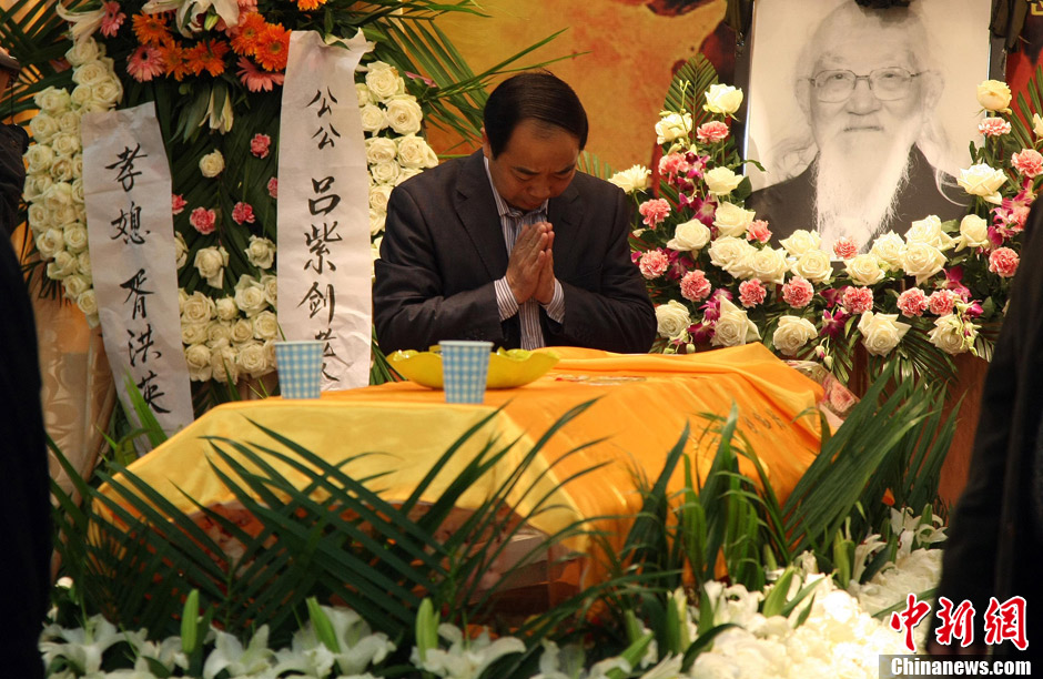 10月22日晚,一代武术大师吕紫剑老人的追悼会在重庆市莲花公墓莲花厅举行。图为吕紫剑老人的弟子来到灵堂祭拜。陈超 摄