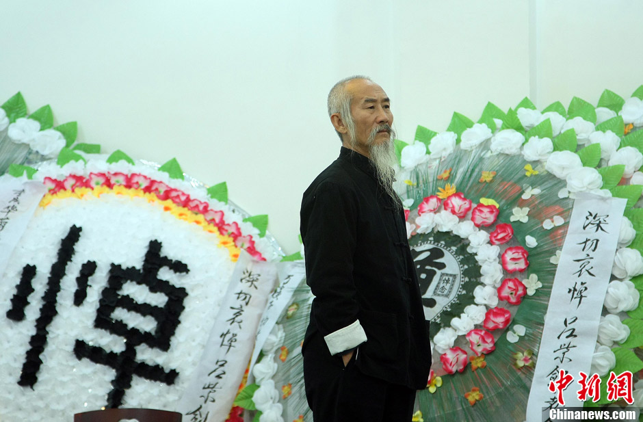 10月22日晚,一代武术大师吕紫剑老人的追悼会在重庆市莲花公墓莲花厅举行。图为吕紫剑老人的弟子赶回重庆看望他。陈超 摄