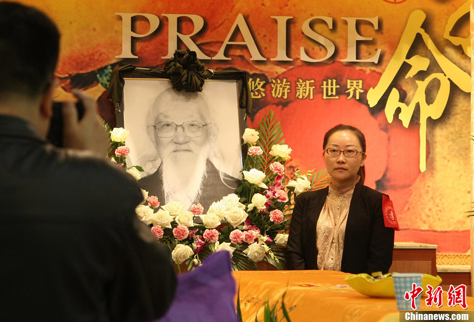 10月22日晚,一代武术大师吕紫剑老人的追悼会在重庆市莲花公墓莲花厅举行。图为在追悼会上远方归来弟子在灵堂与吕紫剑老人合影留恋。陈超 摄