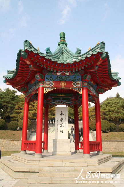 陵园内的六角碑亭,写有“永垂不朽”字迹的石碑屹立其中。(人民网记者 周之然摄)图片来源:人民网