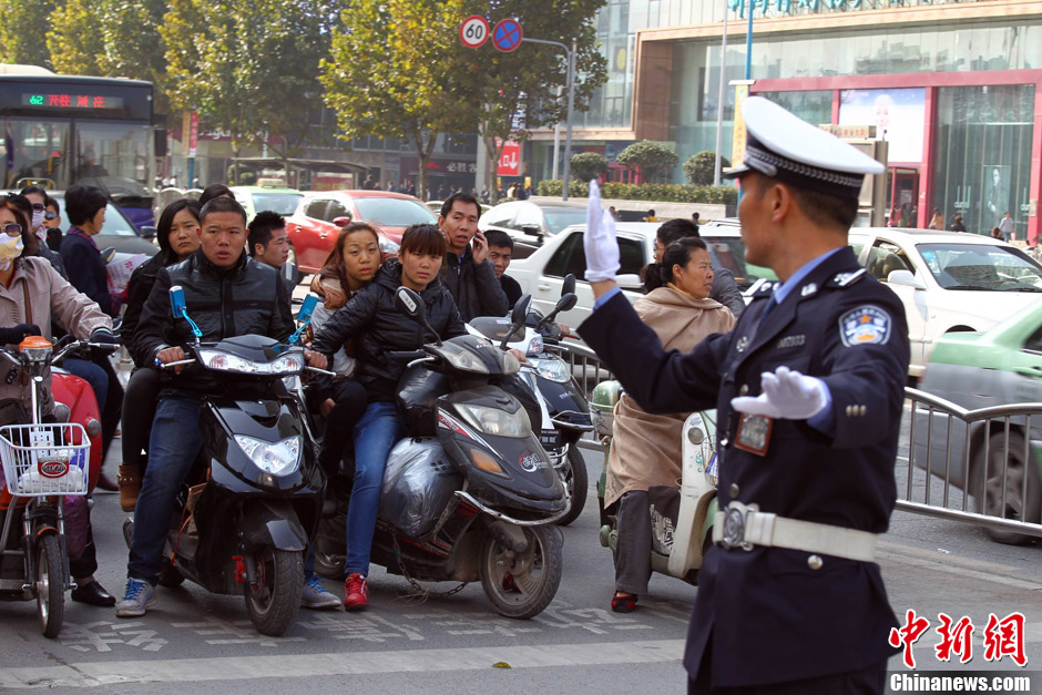 10月30日,河南郑州,河南交通广播主持人与执勤交警杨华民以及交通协管员一起引领过马路的行人正确通行。