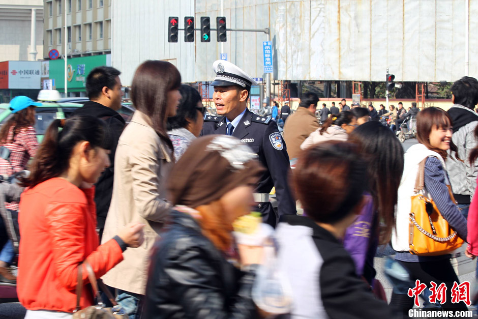 10月30日,河南郑州,河南交通广播主持人与执勤交警杨华民以及交通协管员一起引领过马路的行人正确通行。中新社发 王中举 摄