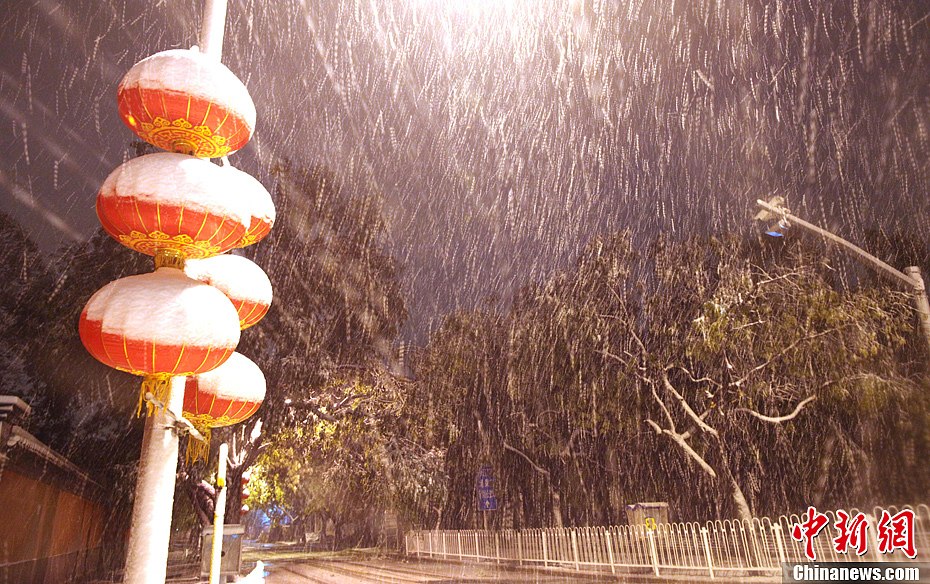 11月4日凌晨,北京的持续中雨因大风降温改为雨加雪,降下年度初雪,城区部分地区降雪量超过10厘米。图为当日北京大风降温雨雪天气夜景。中新社发 杨可佳 摄