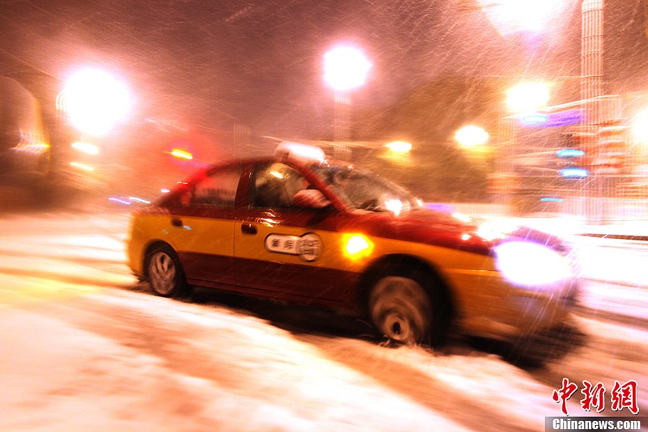 11月4日凌晨,北京的持续中雨因大风降温改为雨加雪,降下年度初雪,城区部分地区降雪量超过10厘米。图为当日北京大风降温雨雪天气夜景。中新社发 杨可佳 摄