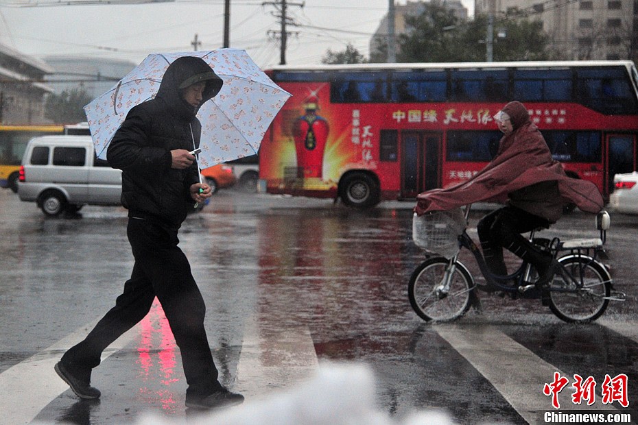 11月4日,北京大街小巷被白雪覆盖,雨雪交加行人出行受阻。3日起,中国北方大部地区遭强冷空气横扫,带来大范围降温雨雪天气。中央气象台11月4日6时发布暴雪橙色预警和寒潮蓝色预警,同时,北京、河北于4日早间相继发布暴雪红色预警,预计这些地区的降雪今天仍将持续。中新网记者 金硕 摄