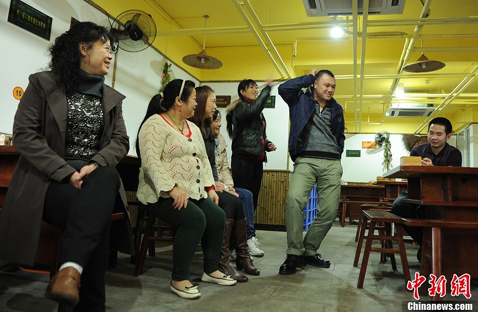 11月7日,重庆市北部新区一家火锅店里一员工喜欢模仿憨豆先生的天然呆,自然萌和那夸张的表情动作,而且常常自编自导自演节目,周边的邻居和同事都叫他“憨豆先生”。尽管他的长相不是很像憨豆先生,但他留了一头很有喜感的发型,从小就喜欢搞笑的他,曾模仿憨豆先生表情和动作几乎一模一样,喜欢表演的他经常进入很多剧组跑龙套,他在工作之余写了剧本《山城开心仔》,想用自己模仿憨豆先生幽默的一面来自导自演该剧本,再加上自创的一些滑稽动作,希望给身边的朋友带来更多的快乐。图为火锅店里的同事正在观看他模仿“憨豆先生”表演。陈超 摄