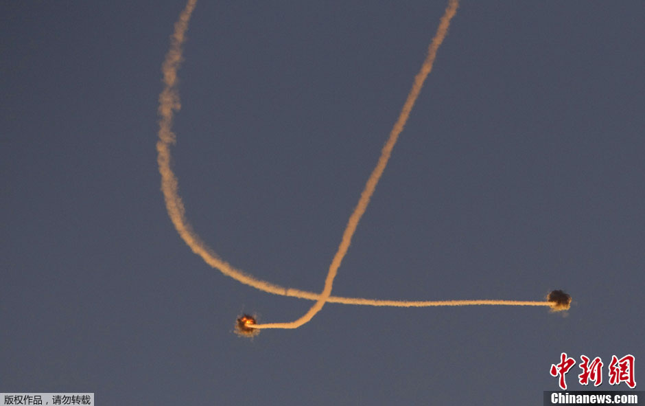 巴以冲突持续升级,当地时间11月15日,来自加沙地带的两枚火箭弹在以色列南部城镇斯代罗特上空被“铁穹”发射的导弹(带轨迹者)拦截。