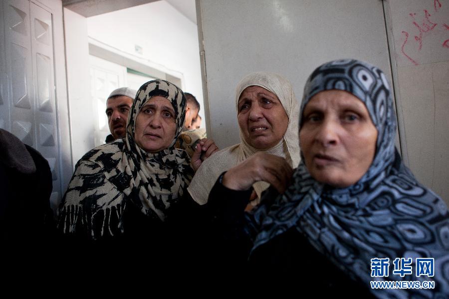 11月19日,在加沙城的希法医院,达卢的家属表情悲痛。陈序 摄 图片来源:新华网