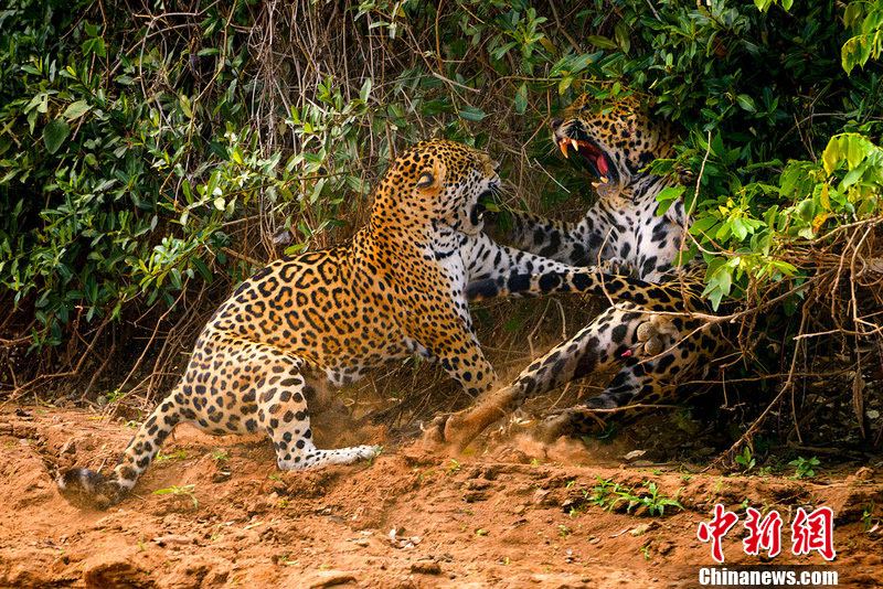 当地时间2012年11月14日,巴西Pantanel,摄影师Octavio Salles拍摄到了两只美洲豹打架的精彩场面,这两只美洲豹扭打在一起,战况惨烈,其中的一只美洲豹咄咄逼人,将另外一只逼近了灌木丛中。图片来源:东方IC 版权作品 请勿转载